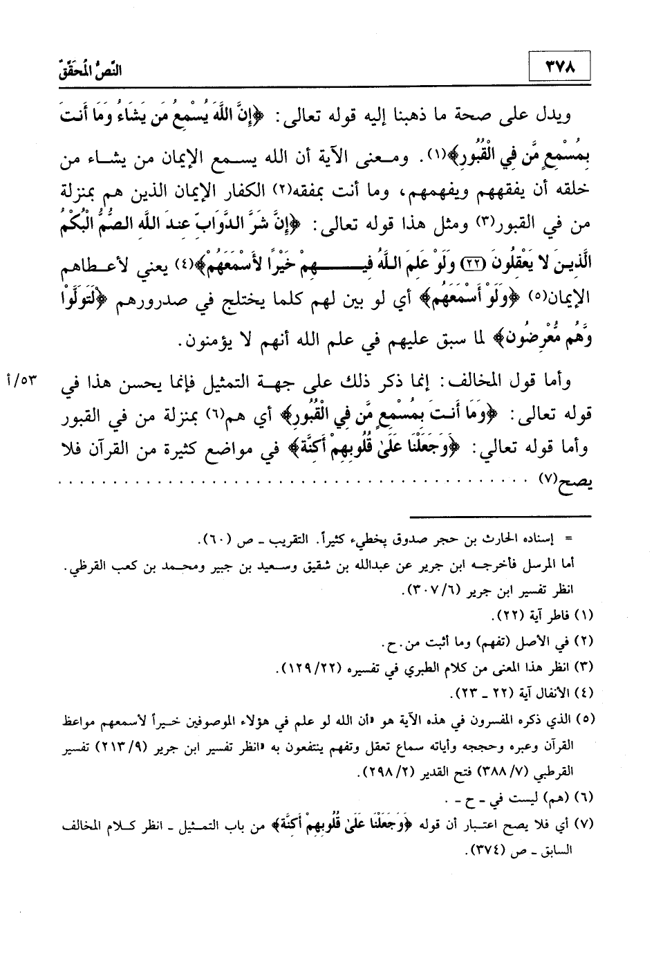 7 أي فلا يصح اعتبار أن قوله: {وَجَعَلْنَا عَلَى قُلُوبِهِمْ أَكِنَّة} من باب التمثيل. انظر: كلام المخالف السابق ص 374.