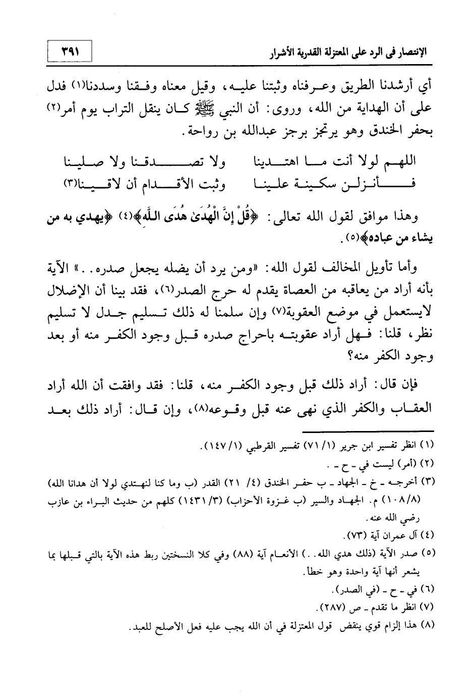 وأما تأويل المخالف لقول الله: {وَمَنْ يُرِدْ أَنْ يُضِلَّهُ يَجْعَلْ صَدْرَهُ} الآية بأنه أراد من يعاقبه من العصاة يقدم له حرج الصدر6، فقد بينّا أن الإضلال لا يستعمل في موضع العقوبة7 وإن سلّمنا له ذلك تسليم جدل لا تسلم نظر قلنا: فهل أراد عقوبته بإحراج صدره قبل وجود الكفر منه أو بعد وجود الكفر منه؟