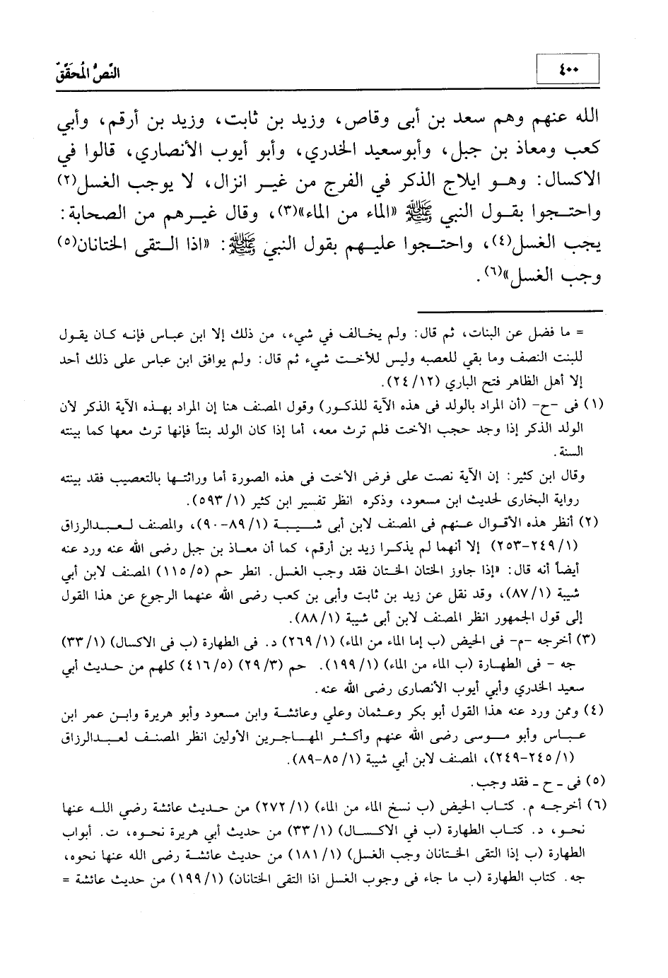 1 انظر هذه الأقوال عنهم في: المصنف لابن أبي شيبة 1/89-90، والمصنف لعبد الرزاق 1/249-253 إلا أنهما لم يذكرا زيد بن أرقم، كما أن معاذ بن جبل - رضي الله عنه - ورد عنه أيضا أنه قال: "إذا جاوز الختان الختان فقد وجب الغسل". انظر: حم 5/115، المصنف لابن أبي شيبة 1/87، وقد نقل عن زيد بن ثابت وأبي بن كعب - رضي الله عنهما - الرجوع عن هذا القول إلى قول الجمهور. انظر: المصنف لابن أبي شيبة 1/88.