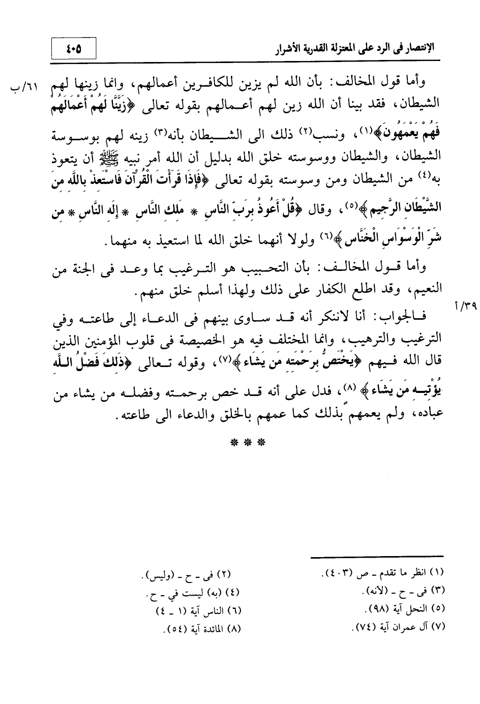 وأما قول المخالف: بأن الله لم يزين للكافرين أعمالهم، وإنما زينها لهم الشيطان، فقد بينا أن الله زين لهم أعمالهم بقوله تعالى: {زَيَّنَّا لَهُمْ أَعْمَالَهُمْ فَهُمْ يَعْمَهُونَ} 1، ونسب2 ذلك إلى الشيطان بأنه3 زينه لهم بوسوسة الشيطان، والشيطان ووسوسته خلق الله بدليل أن الله أمر نبيه صلى الله عليه وسلم أن يتعوذ به4 من الشيطان ومن وسوسته بقوله تعالى: {فَإِذَا قَرَأْتَ الْقُرْآنَ فَاسْتَعِذْ بِاللَّهِ مِنَ الشَّيْطَانِ الرَّجِيمِ} 5 وقال: {قُلْ أَعُوذُ بِرَبِّ النَّاسِ مَلِكِ النَّاسِ إِلَهِ النَّاسِ مِنْ شَرِّ الْوَسْوَاسِ الْخَنَّاسِ} 6 ولولا أنهما خلق الله لما استعيذ به منهما.