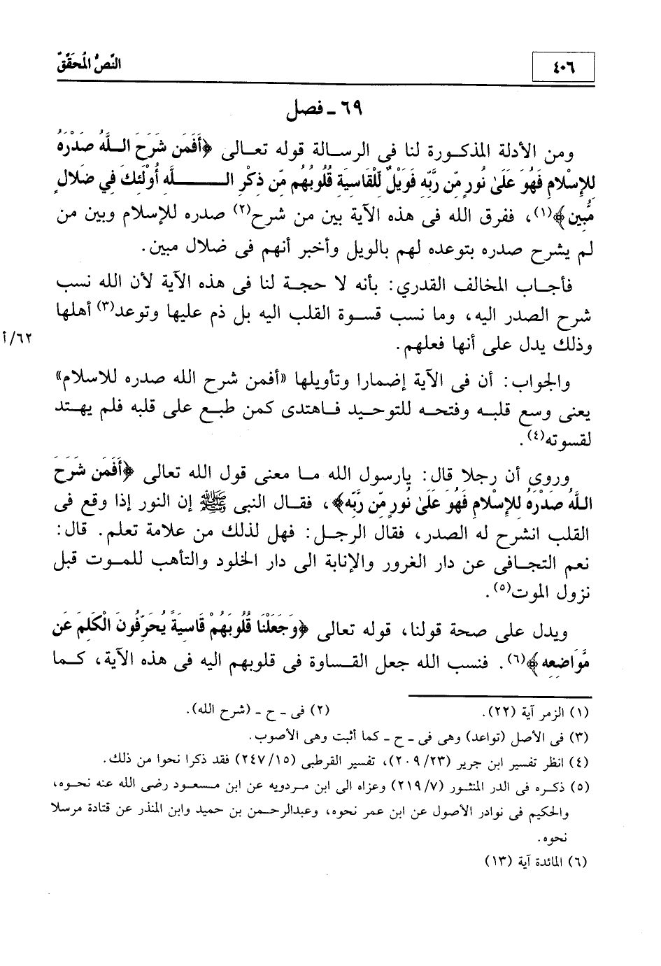 ومن الأدلة المذكورة لنا في الرسالة قوله تعالى: {أَفَمَنْ شَرَحَ اللَّهُ صَدْرَهُ لِلإسْلامِ فَهُوَ عَلَى نُورٍ مِنْ رَبِّهِ فَوَيْلٌ لِلْقَاسِيَةِ قُلُوبُهُمْ مِنْ ذِكْرِ اللَّهِ أُولَئِكَ فِي ضَلالٍ مُبِينٍ} 1، ففرق الله في هذه الآية بين من شرح2 صدره الإسلام وبين من لم يشرح صدره بتوعده لهم بالويل وأخبر أنهم في ضلال مبين.