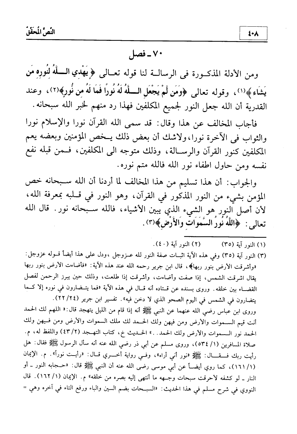 والجواب: أن هذا تسليم من هذا المخالف لما أردنا أن الله سبحانه خص المؤمن بشيء من النور المذكور في القرآن، وهو النور في قلبه بمعرفة الله، لأن أصل النور هو الشيء الذي يبين الأشياء، فالله سبحانه نور. قال الله تعالى: {اللَّهُ نُورُ السَّمَاوَاتِ وَالآرْض} 3.