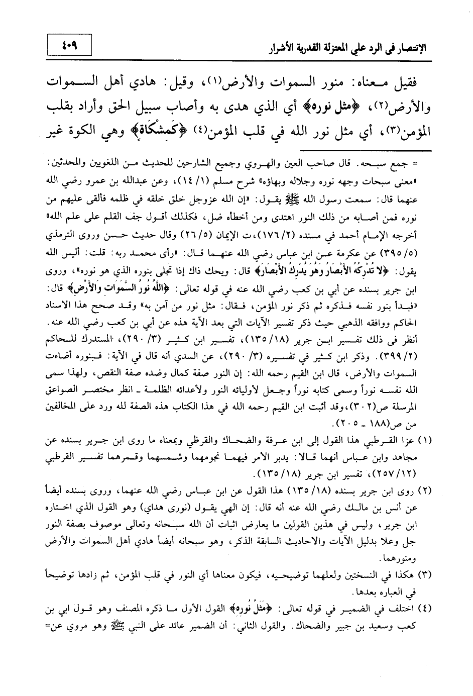2 روى ابن جرير بسنده 18/135 هذا القول عن ابن عباس - رضي الله عنهما -، وروى بسنده أيضا عن أنس بن مالك - رضي الله عنه - أنه قال: "إن إلهي يقول: (نوري هداي) " وهو الذي اختاره ابن جرير، وليس في هذين القولين ما يعارض إثبات أن الله سبحانه موصوف بصفة النور جل وعلا بدليل الآيات والأحاديث السابقة الذكر، وهو سبحانه أيضا هادي أهل السموات والأرض ومنورهما.
