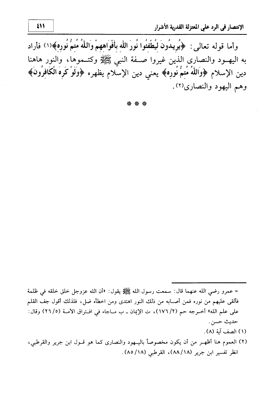 وأما قوله تعالى: {يُرِيدُونَ لِيُطْفِئُوا نُورَ اللَّهِ بِأَفْوَاهِهِمْ وَاللَّهُ مُتِمُّ نُورِهِ} 1 فأراد به اليهود والنصارى الذين غيروا صفة النبي صلى الله عليه وسلم وكتموها، والنور هاهنا دين الإسلام {وَاللَّهُ مُتِمُّ نُورِهِ} يعني دين الإسلام يظهره {وَلَوْ كَرِهَ الْكَافِرُونَ} وهم اليهود والنصارى2.