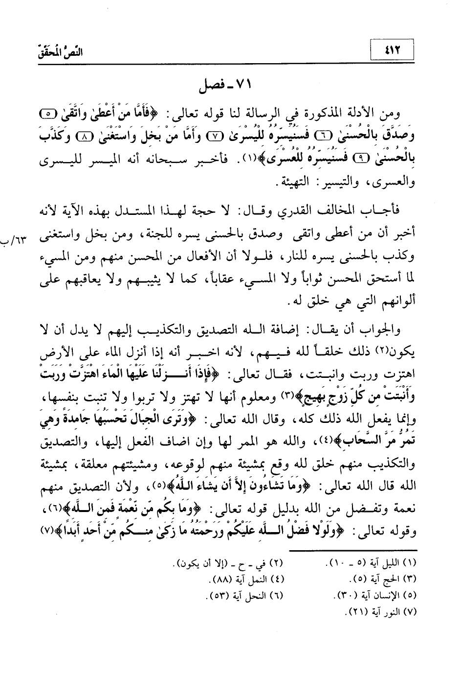 ومن الأدلة المذكورة في الرسالة لنا قوله تعالى: {فَأَمَّا مَنْ أَعْطَى وَاتَّقَى وَصَدَّقَ بِالْحُسْنَى فَسَنُيَسِّرُهُ لِلْيُسْرَى وَأَمَّا مَنْ بَخِلَ وَاسْتَغْنَى وَكَذَّبَ بِالْحُسْنَى فَسَنُيَسِّرُهُ لِلْعُسْرَى} 1. فأخبر سبحانه أنه الميسر لليسرى والعسرى، والتيسير: التهيئة.