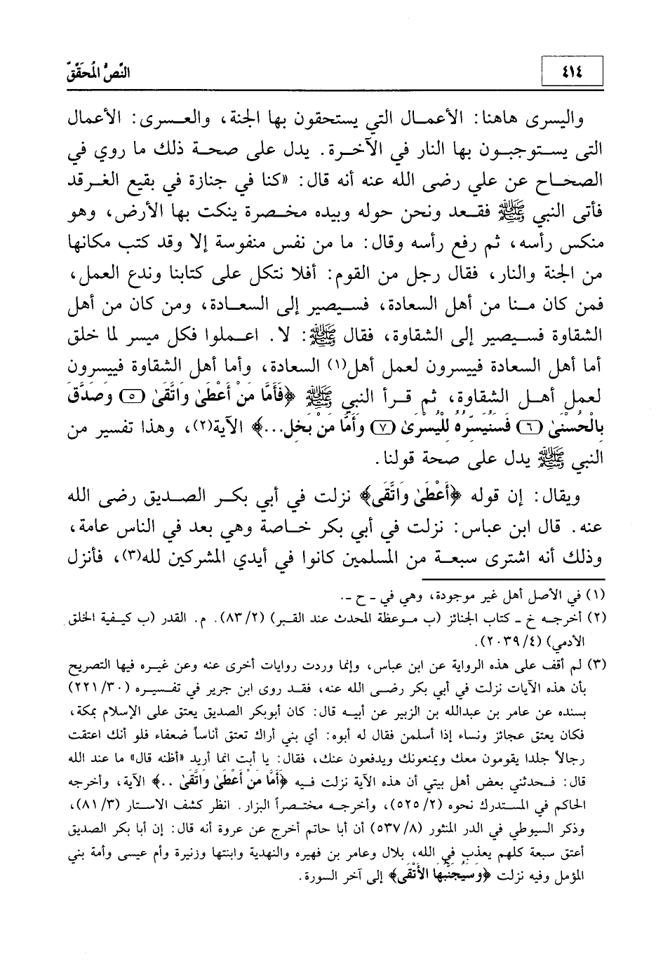 3 لم أقف على هذه الرواية عن ابن عباس، وإنما وردت روايات أخرى عنه وعن غيره فيها التصريح بأن هذه الآيات نزلت في أبي بكر - رضي الله عنه -، فقد روى ابن جرير في تفسيره 30/221 بسنده عن عامر بن عبد الله بن الزبير عن أبيه قال: "كان أبو بكر الصديق يعتق على الإسلام بمكة، فكان يعتق عجائز ونساء إذا أسلمن فقال له أبوه: أي بني أراك تعتق أناسا ضعفاء فلو أنك أعتقت رجالا جلدا يقومون معك ويمنعونك ويدفعون عنك، فقال: يا أبت إنما أريد - أظنه قال - ما عند الله. قال: فحدثني بعض أهل بيتي أن هذه الآية نزلت فيه {فَأَمَّا مَنْ أَعْطَى وَاتَّقَى..} الآية، وأخرجه الحاكم في المستدرك نحوه 2/525، وأخرجه مختصرا البزار. انظر: كشف الأستار 3/81.