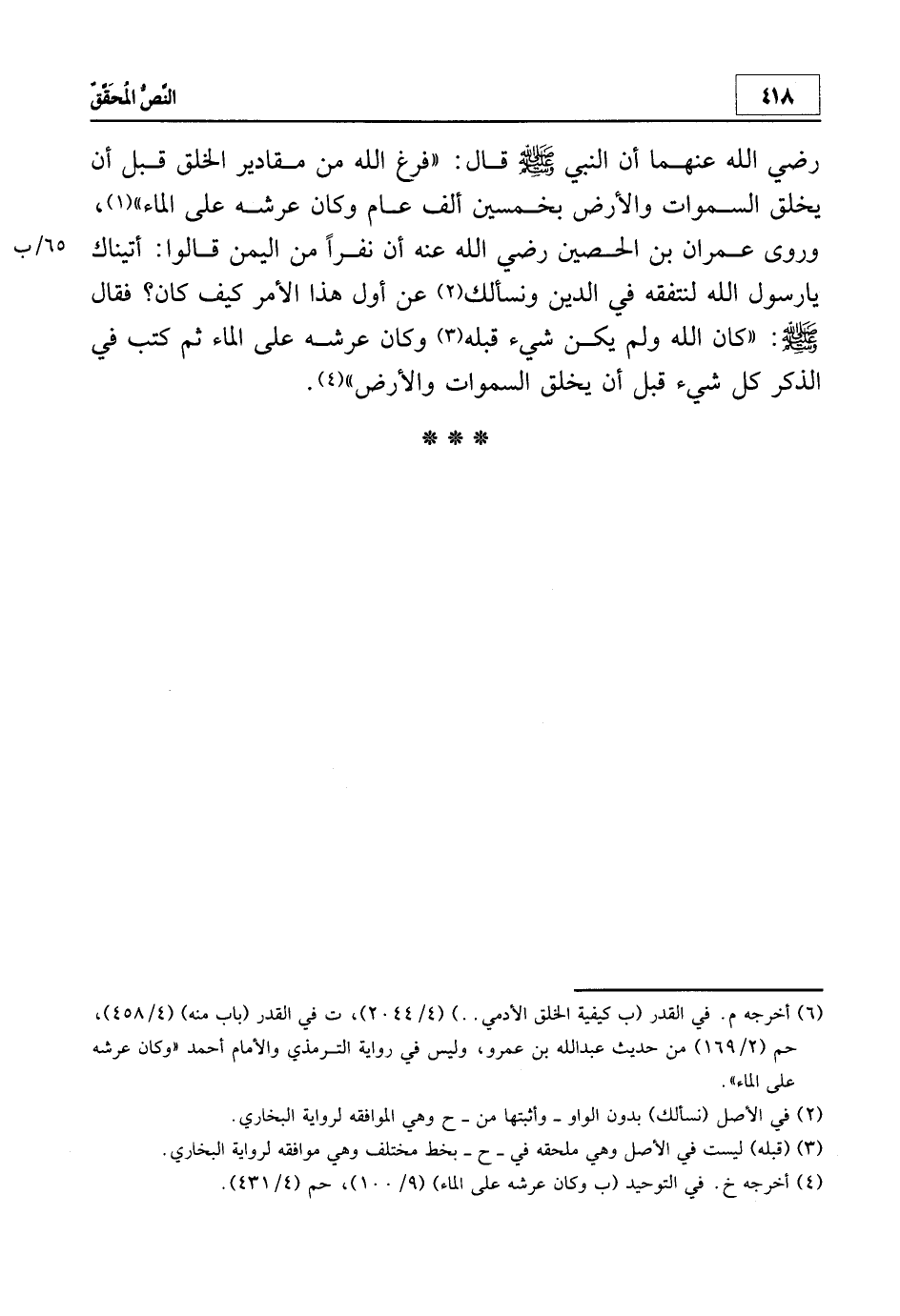 1 أخرجه م. في القدر (ب. كيفية الخلق الآدمي..) 4/2044، ت. في القدر باب منه) 4/458) ، حم. 2/169 من حديث عبد الله بن عمرو، وليس في رواية الترمذي والإمام أحمد (وكان عرشه على الماء) .