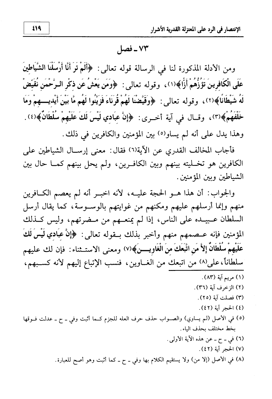 ومن الأدلة المذكورة لنا في الرسالة قوله تعالى: {أَلَمْ تَرَ أَنَّا أَرْسَلْنَا الشَّيَاطِينَ عَلَى الْكَافِرِينَ تَؤُزُّهُمْ أَزّاً} 1، وقوله تعالى: {وَمَنْ يَعْشُ عَنْ ذِكْرِ الرَّحْمَنِ نُقَيِّضْ لَهُ شَيْطَاناً} 2، وقوله تعالى: {وَقَيَّضْنَا لَهُمْ قُرَنَاءَ فَزَيَّنُوا لَهُمْ مَا بَيْنَ أَيْدِيهِمْ وَمَا خَلْفَهُمْ} 3، وقال في آية أخرى: {إِنَّ عِبَادِي لَيْسَ لَكَ عَلَيْهِمْ سُلْطَانٌ} 4. وهذا يدل على أنه لم يساو5 بين المؤمنين والكافرين في ذلك.