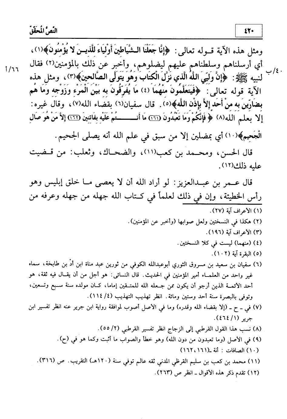 ومثل هذه الآية قوله تعالى: {فَيَتَعَلَّمُونَ مِنْهُمَا4 مَا يُفَرِّقُونَ بِهِ بَيْنَ الْمَرْءِ وَزَوْجِهِ وَمَا هُمْ بِضَارِّينَ بِهِ مِنْ أَحَدٍ إِلاّ بِإِذْنِ اللَّهِ} 5. قال سفيان6 بقضاء الله7، وقال غيره: "إلا بعلم الله"8 {فَإِنَّكُمْ وَمَا تَعْبُدُونَ9 مَا أَنْتُمْ عَلَيْهِ بِفَاتِنِين إِلاّ مَنْ هُوَ صَالِ الْجَحِيمِ} 10 أي بمضلين إلا من سبق في علم الله أنه يصلي الجحيم".