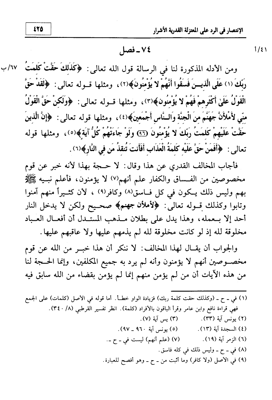 ومن الأدلة المذكورة لنا في الرسالة قول الله تعالى: {كَذَلِكَ حَقَّتْ كَلِمَتُ رَبِّكَ1 عَلَى الَّذِينَ فَسَقُوا أَنَّهُمْ لا يُؤْمِنُونَ} 2 ومثلها قوله تعالى: {لَقَدْ حَقَّ الْقَوْلُ عَلَى أَكْثَرِهِمْ فَهُمْ لا يُؤْمِنُونَ} 3، ومثلها قوله تعالى: {وَلَكِنْ حَقَّ الْقَوْلُ مِنِّي لأمْلأنَّ جَهَنَّمَ مِنَ الْجِنَّةِ وَالنَّاسِ أَجْمَعِينَ} 4، ومثلها قوله تعالى: {إِنَّ الَّذِينَ حَقَّتْ عَلَيْهِمْ كَلِمَتُ رَبِّكَ لا يُؤْمِنُونَ وَلَوْ جَاءَتْهُمْ كُلُّ آيَةٍ} 5، ومثلها قوله تعالى: {أَفَمَنْ حَقَّ عَلَيْهِ كَلِمَةُ الْعَذَابِ أَفَأَنْتَ تُنْقِذُ مَنْ فِي النَّارِ} 6.