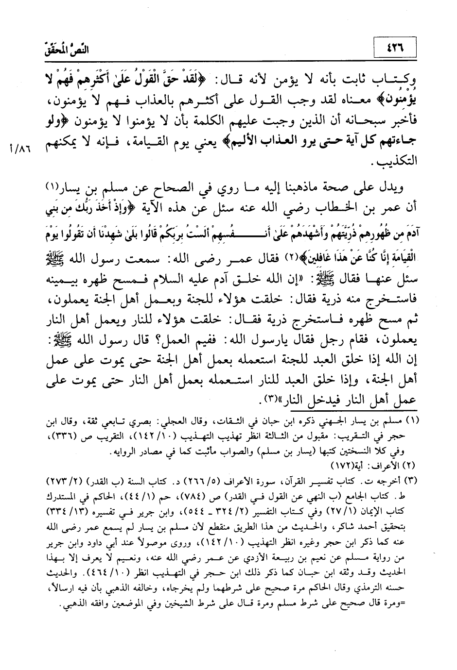 3 أخرجه ت. كتاب تفسير القرآن، (ب. سورة الأعراف) 5/266، د. كتاب السنة (ب. القدر) 2/273، ط. كتاب الجامع (ب. النهي عن القول في القدر ص784، حم. 1/44، الحاكم في المستدرك كتاب الإيمان 1/27 وفي كتاب التفسير 2/324-544) ، وابن جرير في تفسيره 13/334 بتحقيق أحمد شاكر، والحديث من هذا الطريق منقطع لأن مسلم بن يسار لم يسمع عمر - رضي الله عنه - كما ذكر ابن حجر وغيره. انظر: التهذيب 10/142، وروي موصولا عند أبي داود ابن جرير من وراية مسلم عن نعيم بن ربيعة الأزدي عن عمر - رضي الله عنه -، ونعيم لا يعرف إلا بهذا الحديث وقد وثقه ابن حبان كما ذكر ذلك ابن حجر في التهذيب. انظر: 10/464.