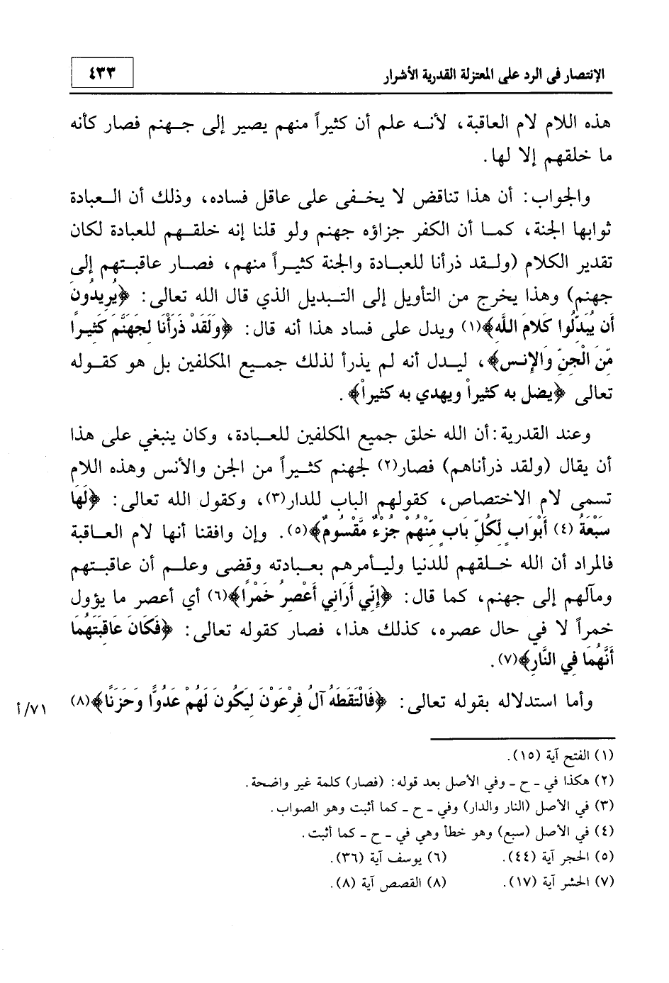 والجواب: أن هذا تناقض لا يخفى على عاقل فساده، وذلك أن العبادة ثوابها، كما أن الكفر جزاؤه جهنم لو قلنا إنه خلقهم للعبادة لكان تقدير الكلام (ولقد ذرأنا للعبادة والجنة كثيراً منهم، فصار عاقبتهم إلى جهنم) وهذا يخرج من التأويل إلى التبديل الذي قال الله تعالى: {يُرِيدُونَ أَنْ يُبَدِّلُوا كَلامَ اللَّهِ} 1 ويدل على فساد هذا أنه قال: {وَلَقَدْ ذَرَأْنَا لِجَهَنَّمَ كَثِيراً مِنَ الْجِنِّ} ، ليدل أنه لم يذرأ لذلك جميع المكلفين بل هو كقوله تعالى: {يُضِلُّ بِهِ كَثِيراً وَيَهْدِي بِهِ كَثِيراً} .
