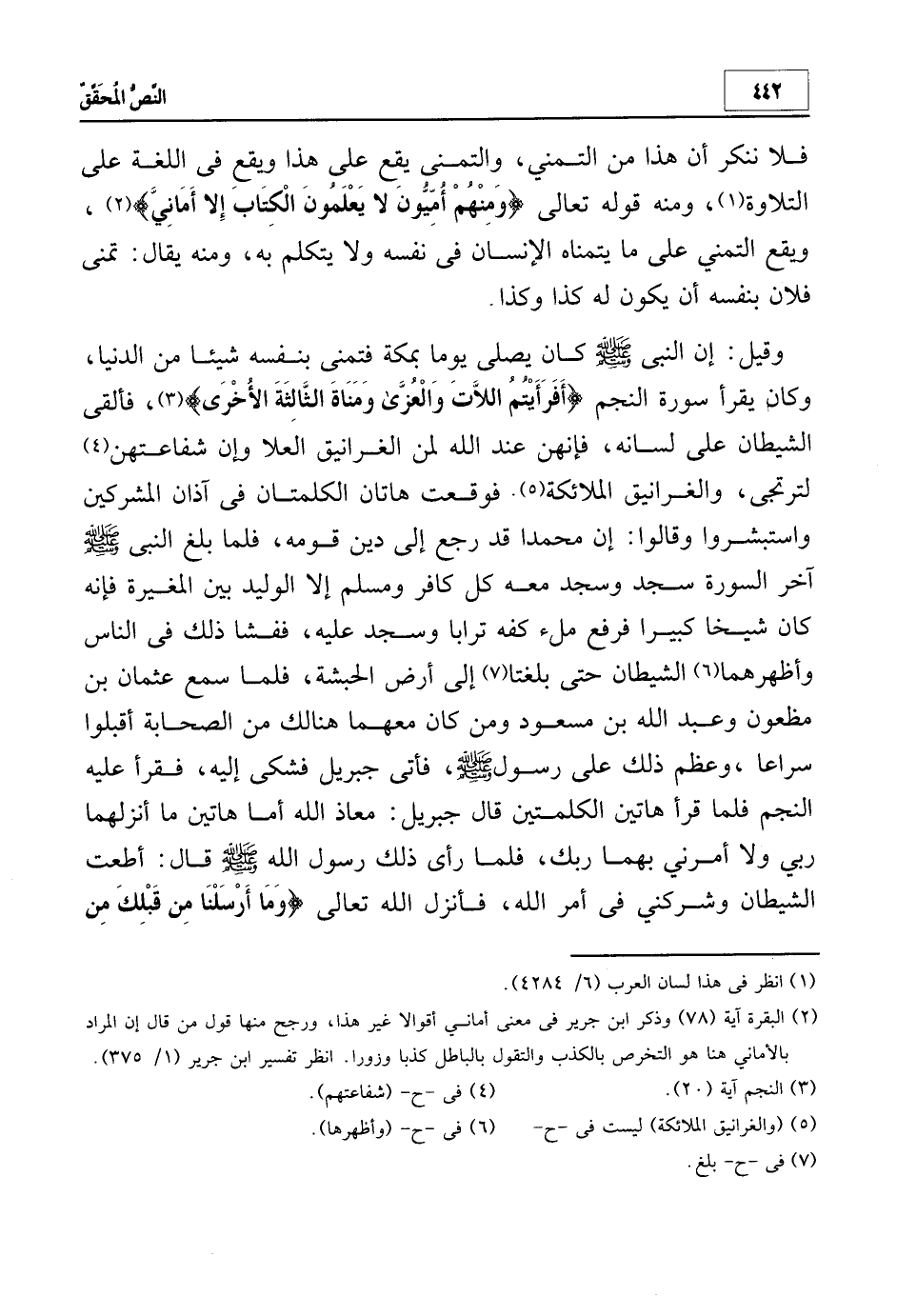 وقيل: إن النبي صلى الله عليه وسلم كان يصلي يوماً بمكة فتمنى بنفسه شيئاً من الدنيا، وكان يقرأ سورة النجم {أَفَرَأَيْتُمُ اللاّتَ وَالْعُزَّى وَمَنَاةَ الثَّالِثَةَ الأخْرَى} 3، فألقى الشيطان على لسانه، فإنهن عند الله لمن الغرانيق العلا وإن شفاعتهن4 لترتجى، والغرانيق الملائكة5. فوقعت هاتان الكلمتان في آذان المشركين واستبشروا وقالوا: إن محمدا قد رجع إلى دين قومه، فلما بلغ النبي صلى الله عليه وسلم آخر السورة سجد وسجد معه كل كافر ومسلم إلا الوليد بن المغيرة فإنه كان شيخاً كبيراً فرفع ملء كفه تراباً وسجد عليه، ففشا ذلك في الناس وأظهرهما6 الشيطان حتى بلغتا7 إلى أرض الحبشة، فلما سمع عثمان بن مظعون وعبد الله بن مسعود ومن كان معهما هنالك من الصحابة أقبلوا سراعاً، وعظم ذلك على رسول الله صلى الله عليه وسلم، فأتى جبريل فشكى إليه، فقرأ عليه النجم فلما قرأ هاتين الكلمتين قال جبريل: معاذ الله أما هاتين ما أنزلهما ربي ولا أمرني بهما ربك، فلما رأى ذلك رسول الله صلى الله عليه وسلم قال: أطعت الشيطان وشركني في أمر الله، فأنزل الله تعالى {وَمَا أَرْسَلْنَا مِنْ قَبْلِكَ مِنْ
