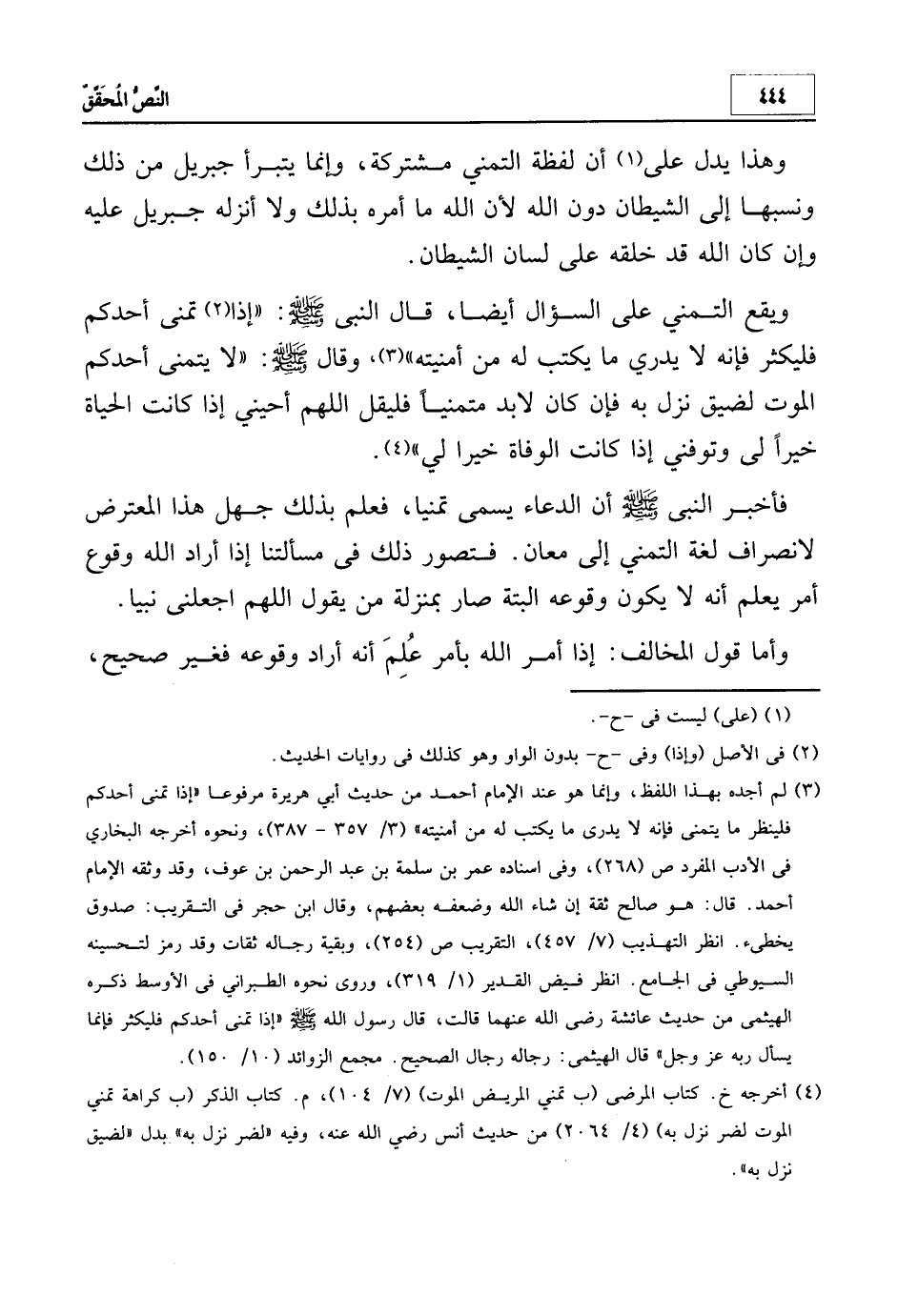 فأخبر النبي صلى الله عليه وسلم أن الدعاء يسمى تمنياً، فعلم بذلك جهل هذا المعترض لانصراف لغة التمني إلى معان، فتصور ذلك في مسألتنا إذا أراد الله وقوع أمر يعلم أنه لا يكون وقوعه ألبتة صار من يقول اللهم اجعلني نبياً.