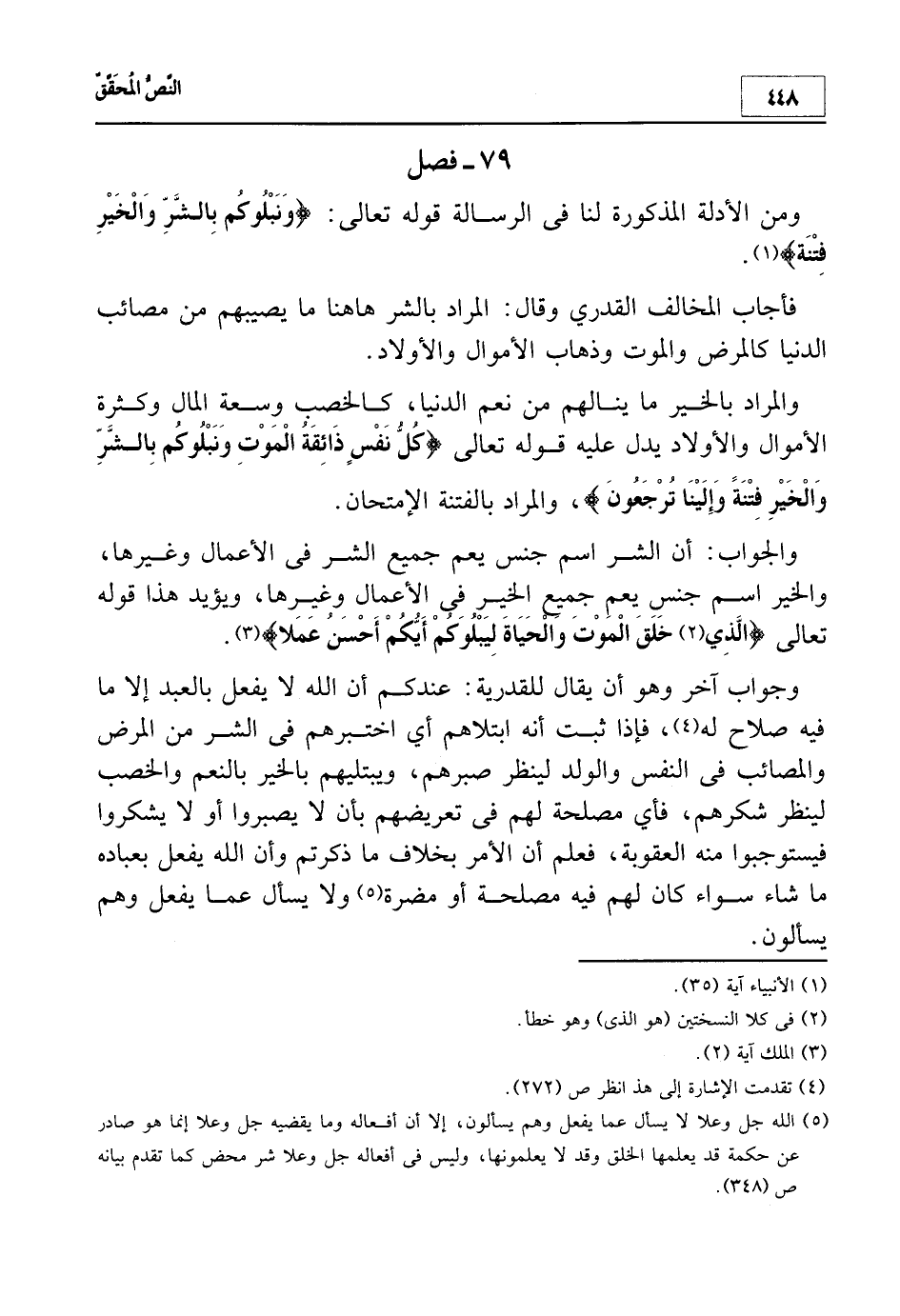 5 الله جل وعلا لا يسأل عما يفعل وهم يسألون، إلا أن أفعاله وما يقضيه جل وعلا إنما هو صار عن حكمة قد يعلمها الخلق وقد لا يعلمونها، وليس في أفعاله جل وعلا شر محض كما تقدم بيانه ص 348.