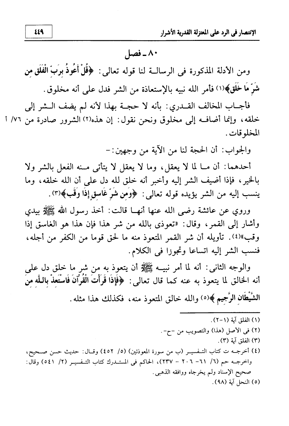 ومن الأدلة المذكورة لنا في الرسالة قوله تعالى: {قُلْ أَعُوذُ بِرَبِّ الْفَلَقِ مِنْ شَرِّ مَا خَلَقَ} 1 فأمر الله نبيه بالاستعاذة من الشر فدل على أنه مخلوق.