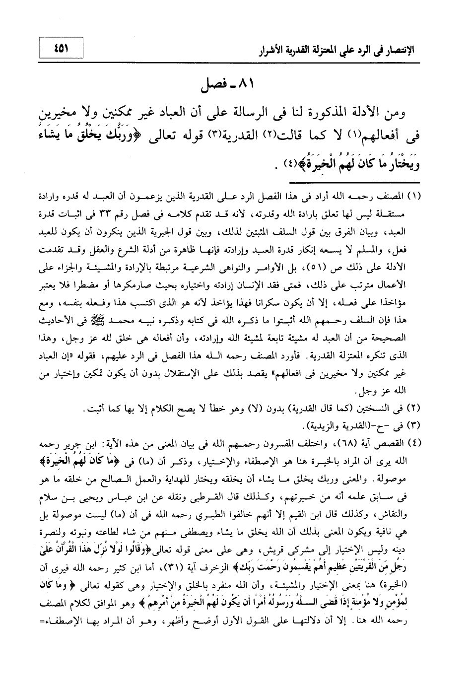 4 القصص آية (68) ، واختلف المفسرون - رحمهم الله - في بيان المعنى من هذه الآية: ابن جرير - رحمه الله - يرى أن المراد بالخيرة هنا هو الاصطفاء والاختيار، وذكر أن (ما) في {مَا كَانَ لَهُمُ الْخِيَرَةُ} موصولة. والمعنى وربك يختار يخلق ما يشاء أن يخلقه ويختار للهداية والعمل الصالح من خلقه ما هو في سابق علمه أنه من خبرتهم، وكذلك قال القرطبي ونقله عن ابن عباس ويحيى بن سلام والنقاش، وكذلك قال ابن القيم إلا أنهم خالفوا الطبري - رحمه الله - في أن (ما) ليست موصولة بل هي نافية ويكون المعتى بذلك أن الله يخلق ما يشاء ويصطفي منهم من شاء لطاعته ونبوته ولنصرة دينه وليس الاختيار إلى مشركي قريش، وهي على معنى قوله تعالى: {وَقَالُوا لَوْلا نُزِّلَ هَذَا الْقُرْآنُ عَلَى رَجُلٍ مِنَ الْقَرْيَتَيْنِ عَظِيم أَهُمْ يَقْسِمُونَ رَحْمَتَ رَبِّكَ} الزخرف آية (31) ، أما ابن كثير - رحمه الله - فيرى أن (الخيرة) هنا بمعنى الاختيار والمشيئة، وأن الله منفرد بالخلق والاختيار وهي كقوله تعالى {وَمَا كَانَ لِمُؤْمِنٍ وَلا مُؤْمِنَةٍ إِذَا قَضَى اللَّهُ وَرَسُولُهُ أَمْراً أَنْ يَكُونَ لَهُمُ الْخِيَرَةُ مِنْ أَمْرِهِم} وهو الموافق لكلام المصنف - رحمه الله - هنا، إلا أن دلالتها على القول الأول أوضح وأظهر، وهو أن المراد بها الاصطفاء والاختيار لأن أول الآية وهو قوله تعالى {وَرَبُّكَ يَخْلُقُ مَا يَشَاءُ وَيَخْتَارُ} معناه أن الله المنفرد بالخلق وهو المنفرد بالاصطفاء، فيكون الكلام بعدها من باب تأكيد اختصاص الله بذلك، ونفي أن يكون للمشركين دخل في الاصطفاء والاختيار، كما أن آية الأحزاب {وَمَا كَانَ لِمُؤْمِنٍ وَلا مُؤْمِنَةٍ إِذَا قَضَى اللَّهُ وَرَسُولُهُ أَمْراً أَنْ يَكُونَ لَهُمُ الْخِيَرَةُ مِنْ أَمْرِهِمْ} ليس المراد بها نفي المشيئة والاختيار، إنما المراد منها نفي أن يكون للمؤمنين اختيار حيال شرع الله وقضائه، بل هم ملزمون بالأخذ به وعدم استبداله بغيره، فإن فعلوا ذلك وبدلوا شرع الله وأمره فإنهم يكونون مخالفين وعاصين لله ورسوله. وهذا ظاهر في الآية أيضاً من وصف المخاطبين بصفة الإيمان، ومن سبب نزول الآية في قصة زينب بنت جحش - رضي الله عنها - في زواجها من زيد بن حارثة - رضي الله عنه -. انظر: تفسير الطبري 20/100، تفسير ابن كثير 3/397، تفسير القرطبي 13/305، زاد المعاد 1/39.