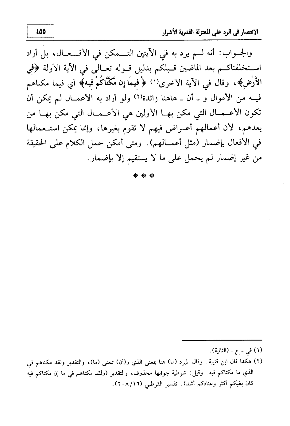 والجواب: أنه لم يرد في الآيتين التمكن في الأفعال، بل أراد استخلفناكم بعد الماضيين بدليل قوله تعالى في الآية الأولى: {فِي الأرْضِ} ، وقال في الآية الأخرى1 {فِيمَا إِنْ مَكَّنَّاكُمْ فِيهِ} أي فيما مكناهم فيه من الأموال و - أن - هاهنا زائدة2 ولو أراد به الأعمال لم يمكن أن تكون الأعمال التي مكن بها الأولين هي الأعمال التي مكن بها من بعدهم، لأن أعمالهم أعراض فيهم لا تقوم بغيرها، وإنما يمكن استعمالها في الأفعال بإضمار (مثل أعمالهم) . ومتى أمكن حمل الكلام على الحقيقة من غير إضمار لم يحمل على ما لا يستقيم إلا بإضمار.