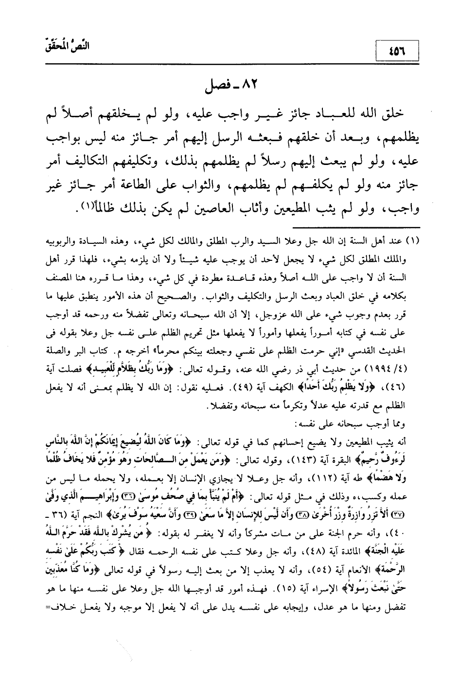 أما قول المصنف هنا (أنه لو لم يثب المطيعين وأثاب العاصين لم يكن ظالماً لهم) فهذا بالنسبة لمن نظر إلى أن الخلق وجميع ما في السموات والأرض ملك لله وتحت تصرفه، فعليه لو تصرف في ملكه بأي شكل فلا يقال عنه ظالم، لأن الظلم عند هؤلاء هو التصرف في ملك الغير بدون وجه حق، والخلق تحت ملكه وتصرفه فيهم واقع ضمن تصرف المالك في ملكه، وهو قول الأشاعرة ومن تبعهم، والصحيح أن هذا من الظلم الذي نفاه الله عزوجل عن نفسه وهو في الجزاء والحساب فلا يحمل الإنسان سيئات لم يعملها، ولا يضيع له أجر حسنات عملها يدل على هذا قوله تعالى: {وَمَنْ يَعْمَلْ مِنَ الصَّالِحَاتِ وَهُوَ مُؤْمِنٌ فَلا يَخَافُ ظُلْماً وَلا هَضْماً} طه آية (112) ، {مَنْ عَمِلَ صَالِحاً فَلِنَفْسِهِ وَمَنْ أَسَاءَ وَمَا رَبُّكَ بِظَلاّمٍ لِلْعَبِيدِ} فصلت الآية (46) ، فهذا يدل على أن عدم إثابة المطيعين من الظلم الذي حرمه الله على نفسه تفضلاً منه ورحمة منه فلا يفعله، فعليه لا يصح أن يقال إنه لو لم يثب المطيعين لم يكن ظالماً لهم، أما قوله "وأثاب العاصين لم يكن ظالماً" فهذا داخل تحت تفضل الله ورحمته بعباده، فقد يفعله وقد لا يفعله، فإن فعله فلا يقال إنه عنه ظلم لأن له أن يتفضل على من يشاء بترك عقوبته لأن عقوبة العاصي حق له جل وعلا فإن شاء عاقبه عدلاً وإن شاء تركه فضلاً، وهذا إنما هو في المعاصي دون الشرك، أما الشرك فإنه لا يغفره جل وعلا كما قال: {إِنَّ اللَّهَ لا يَغْفِرُ أَنْ يُشْرَكَ بِهِ وَيَغْفِرُ مَا دُونَ ذَلِكَ لِمَنْ يَشَاءُ} . انظر: الفتاوى لشيخ الإسلام 18/137- 148، مفتاح دار السعادة 2/104- 113، لوامع الأنوار البهية 1/320- 333.