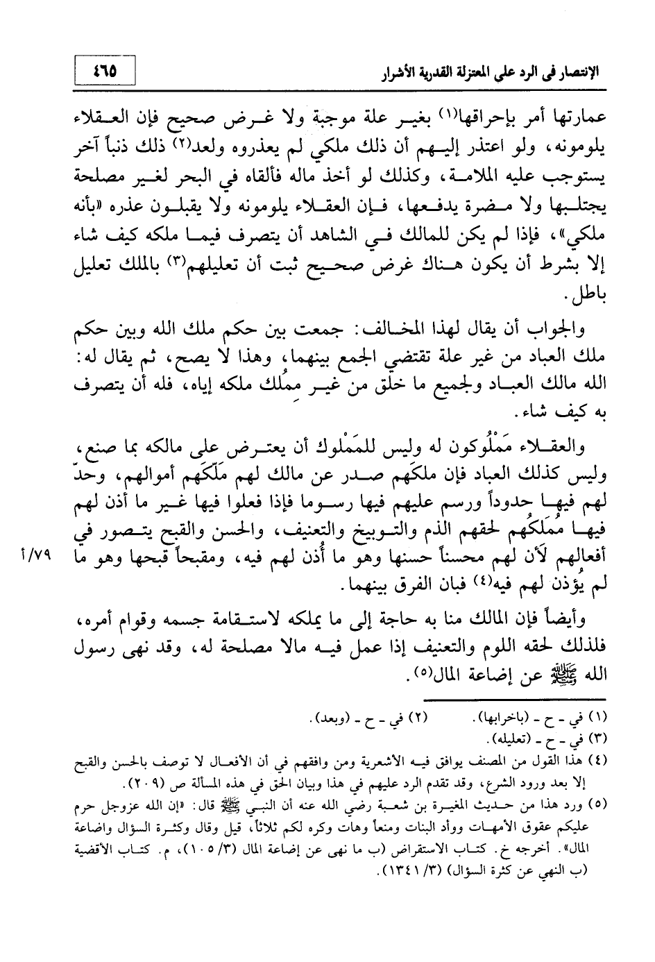 عمارتها أمر بإحراقها1 بغير علة موجبة ولا غرض صحيح فإن العقلاء يلومونه، ولو اعتذر إليهم أن ذلك ملكي لم يعذروه ولعد2 ذنباً آخر يستوجب عليه الملامة، وكذلك لو أخذ ماله فألقاه في البحر لغير مصلحة يجتلبها ولا مضرة يدفعها، فإن العقلاء يلومونه ولا يقبلون عذره (بأنه ملكي) ، فإذا لم يكن للمالك في الشاهد أن يتصرف فيما ملكه كيف شاء إلا بشرط أن يكون هناك غرض صحيح ثبت أن تعليلهم3 بالملك تعليل باطل.