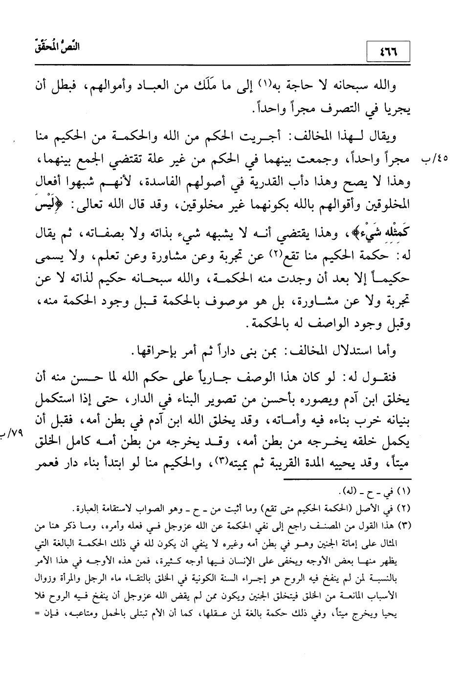 3 هذا القول من المصنف راجع إلى نفي الحكمة عن الله عزوجل في فعله وأمره، وما ذكر هنا من المثال على إماتة الجنين وهو في بطن أمه وغيره لا ينفي أن يكون لله في ذلك الحكمة البالغة التي يظهر منها بعض الأوجه ويخفى على الإنسان فيها أوجه كثيرة، فمن هذه الأوجه في هذا الأمر بالنسبة لمن لم ينفخ فيه الروح هو إجراء السنة الكونية في الخلق بالتقاء ماء الرجل والمرأة وزوال الأسباب المانعة من الخلق فيتخلق الجنين ويكون ممن لم يقض الله عزوجل أن ينفخ فيه الروح فلا يحيا ويخرج ميتاً، وفي ذلك حكمة بالغة لمن عقلها، كما أن الأم تبتلى بالحمل ومتاعبه، فإن كانت مسلمة أجرت على هذا البلاء والمشقة التي تلحقها بسبب الحمل، وإن كانت غير ذلك لم تؤجر على ذلك في الآخرةن وقد تؤجر في الدنيا وقد يكون هناك حِكَم أخرى بهذا من ابتلاء الأبوين بالسراء والضراء وما يترتب على ذلك من الجزاء والعقاب، أما إن نفخ فيه الروح ثم مات في البطن أو مات بعد الخروج فإن ذلك لا شك لحكمة. ومن أوجه الحكمة ابتلاء الأبوين بالسراء أولاً بفرحهما بهذا الجنين ثم ابتلاؤهما بالضراء بسبب موت ابنهما، وابتلاء أمه بالحمل وما تبعه من مشقة وابتلاؤها بالوضع وما يترتب عليه من آلام وأوجاع في أثنائه وبعده، ولله في ذلك أبلغ الحكمة كما أنه سيكون نافعاً لوالديه إذا كانا مسلمين في الآخرة بشفاعته لهما، فالله جل وعلا له الحكمة في كل أمر وفعل وقد تظهر وقد لا تظهر، والغالب أنه يظهر منها للعباد أوجه تزيد المؤمن إيماناً أما الكافر فلا ينظر ولو نظر لم ينتفع وتكون عليه حجة.