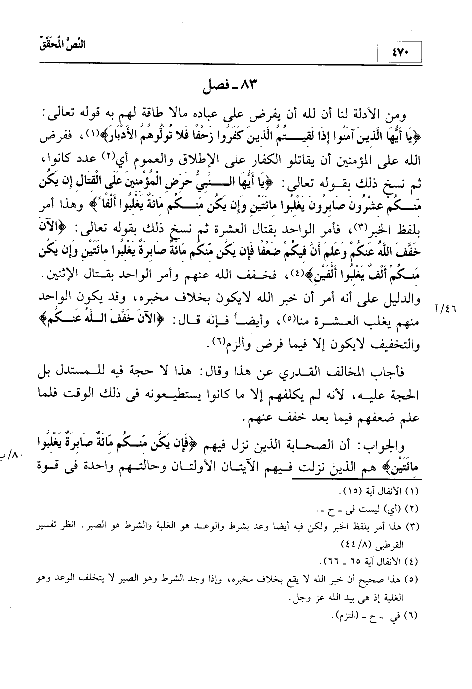 ومن الأدلة لنا أن لله أن يفرض على عباده ما لا طاقة لهم به قوله تعالى: {يَا أَيُّهَا الَّذِينَ آمَنُوا إِذَا لَقِيتُمُ الَّذِينَ كَفَرُوا زَحْفاً فَلا تُوَلُّوهُمُ الأدْبَارَ} 1، ففرض الله على المؤمنين أن يقاتلوا الكفار على الإطلاق والعموم أي2 عدد كانوا، ثم نسخ ذلك بقوله تعالى: {يَا أَيُّهَا النَّبِيُّ حَرِّضِ الْمُؤْمِنِينَ عَلَى الْقِتَالِ إِنْ يَكُنْ مِنْكُمْ عِشْرُونَ صَابِرُونَ يَغْلِبُوا مِائَتَيْنِ وَإِنْ يَكُنْ مِنْكُمْ مِائَةٌ يَغْلِبُوا أَلْفاً} وهذا أمر بلفظ الخبر3، فأمر الواحد بقتال العشرة ثم نسخ ذلك بقوله تعالى: {الآنَ خَفَّفَ اللَّهُ عَنْكُمْ وَعَلِمَ أَنَّ فِيكُمْ ضَعْفاً فَإِنْ يَكُنْ مِنْكُمْ مِائَةٌ صَابِرَةٌ يَغْلِبُوا مِائَتَيْنِ وَإِنْ يَكُنْ مِنْكُمْ أَلْفٌ يَغْلِبُوا أَلْفَيْنِ} 4، فخفف الله عنهم وأمر الواحد بقتال الاثنين. والدليل على أنه أمر أن خبر الله لا يكون بخلاف مخبره، وقد يكون الواحد منهم يغلب العشرة منا5، وأيضاً فإنه قال: {الآنَ خَفَّفَ اللَّهُ عَنْكُمْ} والتخفيف لا يكون إلا فيما فرض وألزم6.