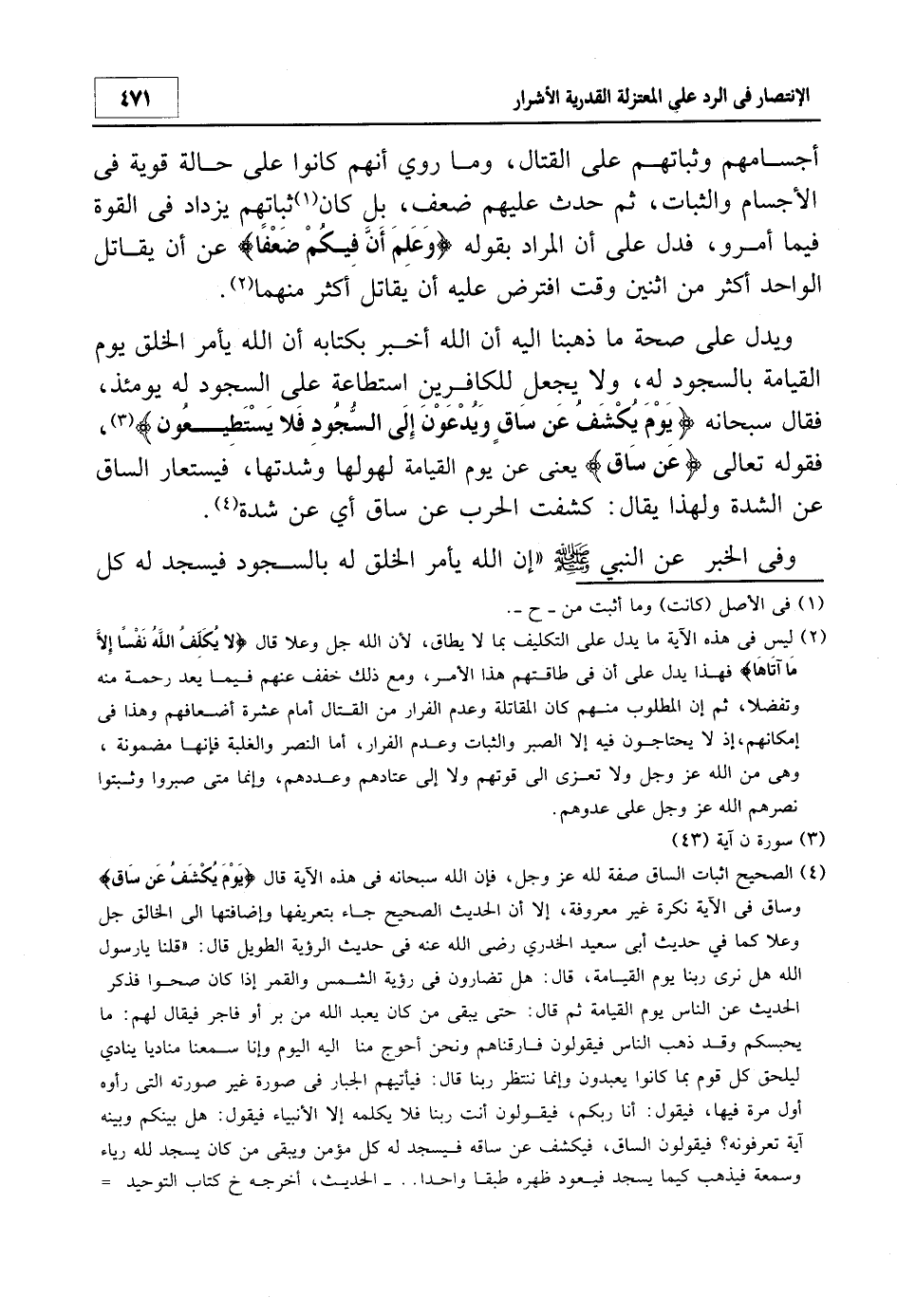 ويدل على صحة ما ذهبنا إليه أن الله أخبر بكتابه أن الله يأمر الخلق يوم القيامة بالسجود له، ولا يجعل للكافرين استطاعة على السجود له يومئذ، فقال سبحانه {يَوْمَ يُكْشَفُ عَنْ سَاقٍ وَيُدْعَوْنَ إِلَى السُّجُودِ فَلا يَسْتَطِيعُونَ} 3، فقوله: {عَنْ سَاقٍ} يعني عن يوم القيامة لهولها وشدتها، فيستعار الساق عن الشدة ولهذا يقال: كشفت الحرب عن ساق أي عن شدة4.