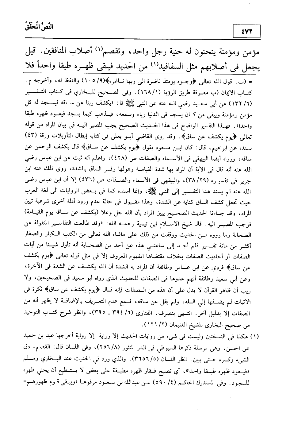 1 هكذا في النسختين وليست في شيء من روايات الحديث إلا رواية أخرجها عبد بن حميد عن الحسن، وهي مرسلة ذكرها السيوطي في الدر المنثور8/256، وفي اللسان قال: القصم، دق الشيء وكسره حتى يبين. انظر: اللسان 5/3656. والذي ورد في الحديث عند البخاري ومسلم (فيعود ظهره طبقاً واحداً) ، أي تصبح فقار ظهره مطبقة على بعض لا يستطيع أن يحني ظهره للسجود. وفي المستدرك للحاكم 4/590 عن عبد الله بن مسعود مرفوعاً: "ويبقى قوم ظهورهم كصياصي البقر يريدون السجود فلا يستطيعون". قال ابن الأثير: "صياصي البقر" أي قرونها واحدتها صيصية". النهاية في غريب الحديث 3/67.