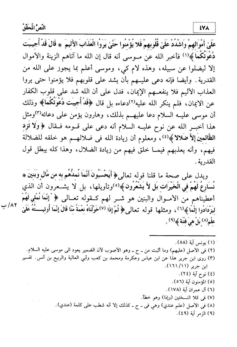 وأيضاً فإنه دعا عليهم بأن يشد على قلوبهم فلا يؤمنوا حتى يروا العذاب الأليم فلا ينفعهم الإيمان فدل على الله شد على قلوب الكفار عن الإيمان، فلم ينكر الله عليه2 دعاءه بل قال: {قَدْ أُجِيبَتْ دَعْوَتُكُمَا} وذلك أن موسى عليه السلام دعا عليهم بذلك، وهارون يؤمن على دعائه3 ومثل هذا أخبر الله عن نوح - عليه السلام - أنه دعا قومه فقال: {وَلا تَزِدِ الظَّالِمِينَ إِلاّ ضَلالاً} 4، ومعلوم أن زيادة الله في ضلالهم هو خلقه للضلالة فيهم، وأنه يعذبهم فيما خلق فيهم من زيادة الضلال، وهذا كله يبطل قول القدرية.