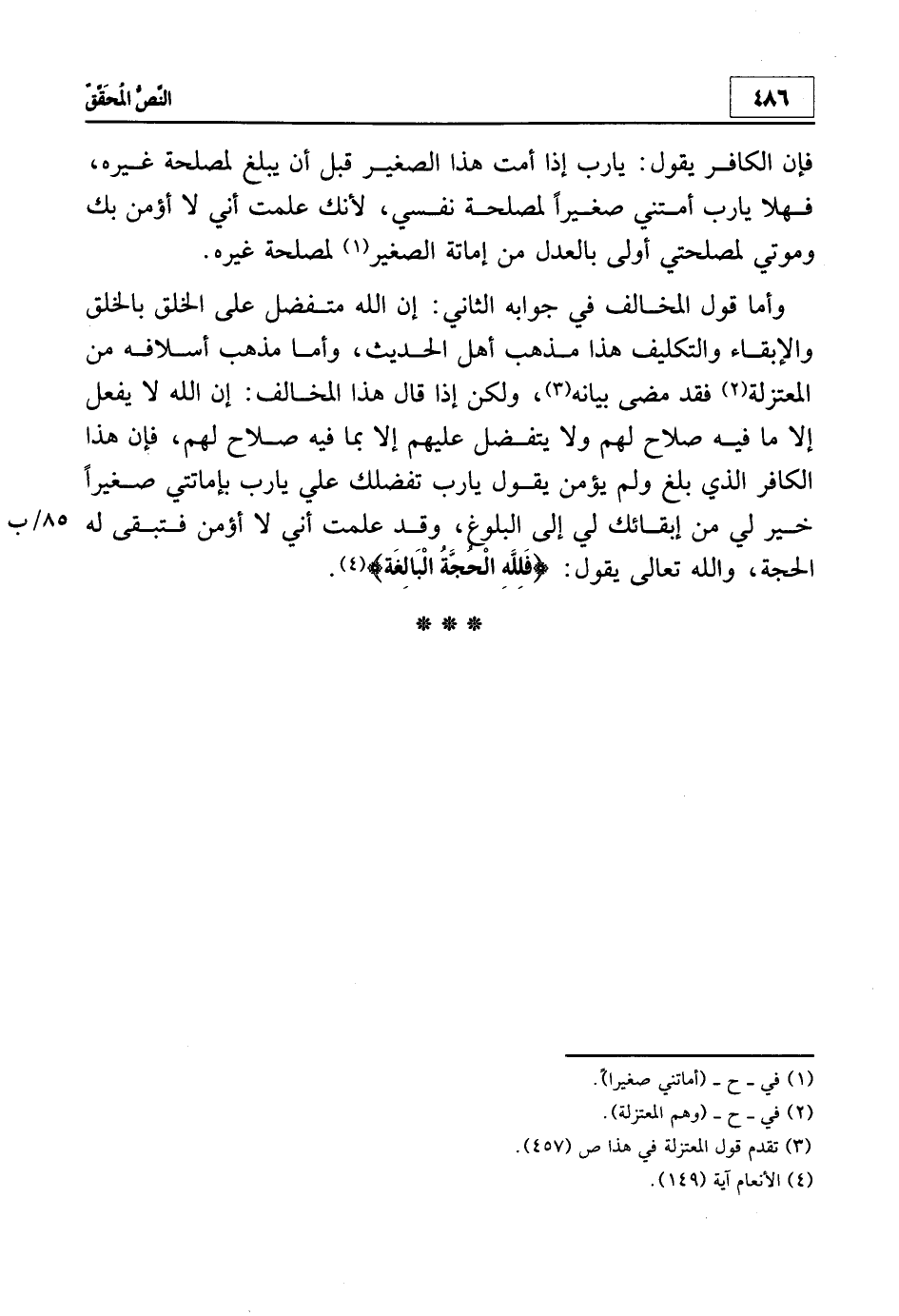 وأما قول المخالف في جوابه الثاني: إن الله متفضل على الخلق بالخلق والإبقاء والتكليف هذا مذهب أهل الحديث، وأما مذهب أسلافه من المعتزلة2 فقد مضى بيانه3، ولكن إذا قال هذا المخالف: إن الله لا يفعل إلا ما فيه صلاح لهم ولا يتفضل عليهم إلا بما فيه صلاح لهم، فإن هذا الكافر الذي بلغ ولم يؤمن يقول يا رب تفضلك عي يا رب بإماتتي صغيراً خير لي من إبقائك لي إلى البلوغ، وقد علمت أني لا أومن فتبقى له الحجة، والله تعالى يقول: {فَلِلَّهِ الْحُجَّةُ الْبَالِغَةُ} 4.