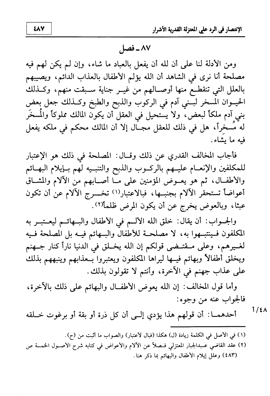2 عقد القاضي عبد الجبار المعتزلي فصلاً عن الآلام والأعواض في كتابه شرح الأصول الخمسة ص 483 وعلل إيلام الأطفال والبهائم بما ذكر هنا.