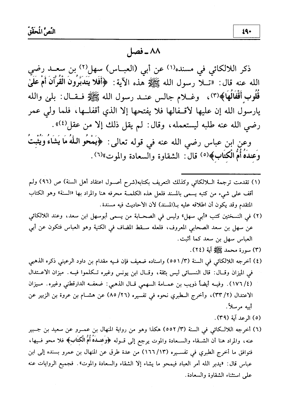 6 أخرجه اللالكائي في السنة 3/552، هكذا وهو من رواية المنهال بن عمرو عن سعيد بن جبير عنه، والمراد هنا أن الشقاء والسعادة والموت يرجع إلى قوله: {وَعِنْدَهُ أُمُّ الْكِتَابِ} فلا محو فيها، فتوافق ما أخرجه الطبري في تفسيره 13/166 من عدة طرق عن المنهال بن عمرو بسنده إلى ابن عباس قال: "يدبر الله أمر العباد فيمحو ما يشاء إلا الشقاء والسعادة والموت". فجميع الروايات عنه على استثناء الشقاوة والسعادة.