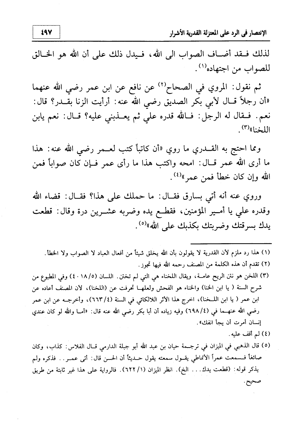 ثم نقول: المروي في الصحاح2 عن نافع عن ابن عمر - رضي الله عنهما - "أن رجلاً قال لأبي بكر الصديق - رضي الله عنه -: أرأيت الزنا بقدر؟، قال: نعم، فقال له الرجل: فالله قدره علي ثم يعذبني عليه؟ قال: نعم يا بن اللخنا"3.
