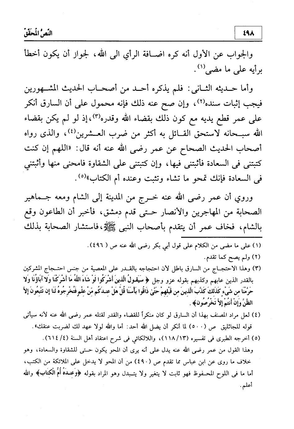 وأما حديثه الثاني: فلم يذكره أحد من أصحاب الحديث المشهورين فيجب إثبات سنده2، وإن صح عنه ذلك فإنه محمول على أن السارق أنكر على عمر قطع يديه مع كون ذلك بقضاء الله وقدره3، إذ لو لم يكن بقضاء الله سبحانه لا ستحق القائل به أكثر من ضرب العشرين4، والذي رواه أصحاب الحديث الصحاح عن عمر - رضي الله عنه - أنه قال: "اللهم إن كنت كتبتني في السعادة فأثبتني فيها، وإن كتبتني على الشقاوة فامنحني منها وأثبتني في السعادة فإنك تمحو مت تشاء وتثبت وعنده أم الكتاب"5.