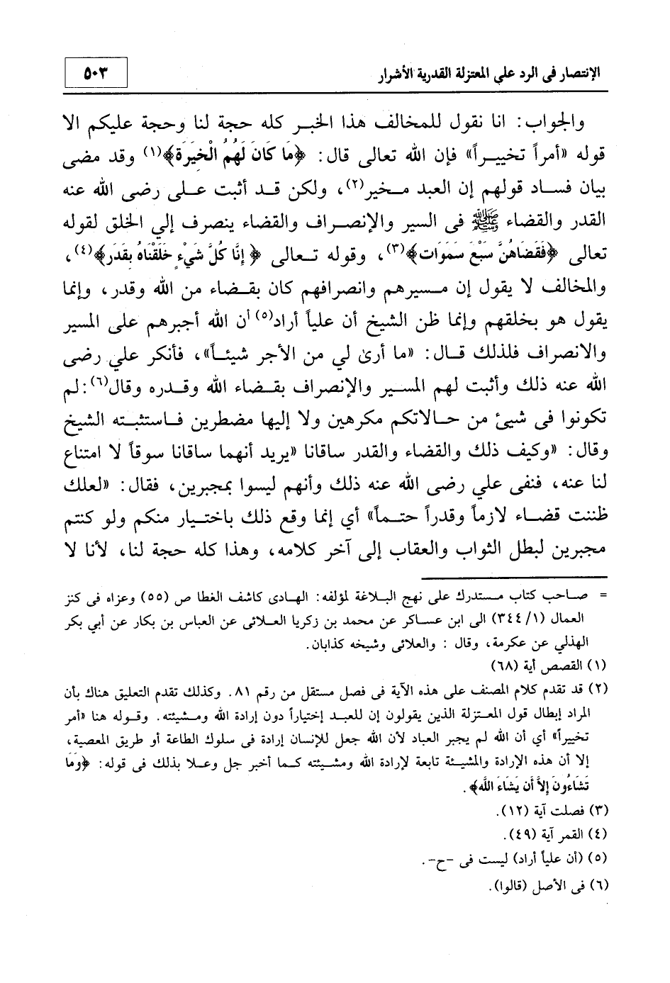 والجواب: أنا نقول للمخالف هذا الخبر كله حجة لنا وحجة عليكم إلا قوله "أمراً تخييراً" فإن الله تعالى قال: {مَا كَانَ لَهُمُ الْخِيَرَةُ} 1، وقد مضى بيان فساد قولهم إن العبد مخير2، ولكن قد أثبت علي - رضي الله عنه - القدر والقضاء في السير والانصراف والقضاء ينصرف إلى الخلق لقوله تعالى: {فَقَضَاهُنَّ سَبْعَ سَمَاوَاتٍ} 3، وقوله تعالى: {إِنَّا كُلَّ شَيْءٍ خَلَقْنَاهُ بِقَدَرٍ} 4، والمخالف لا يقول إن مسيرهم وانصرافهم كان بقضاء من الله وقدر، وإنما يقول هو يخلقهم وإنما ظن الشيخ أن علياً أراد5 أن الله أجبرهم على المسير والانصراف بقضاء الله وقدره وقال6: ":لم تكونوا في شيء من حالاتكم مكرهين ولا إليها مضطرين فاستثبته الشيخ وقال: "وكيف ذلك والقضاء والقدر ساقانا" يريد أنهما ساقانا سوقاً لا امتناع لنا عنه، فنفى علي - رضي الله عنه - ذلك وأنهم ليسوا بمجبرين، فقال: "لعلك ظننت قضاء لازماً وقدراً حتماً" أي إنما وقع ذلك باختيار منكم ولو كنتم مجبرين لبطل الثواب والعقاب إلى آخر كلامه، وهذا كله حجة لنا، لأنا لا