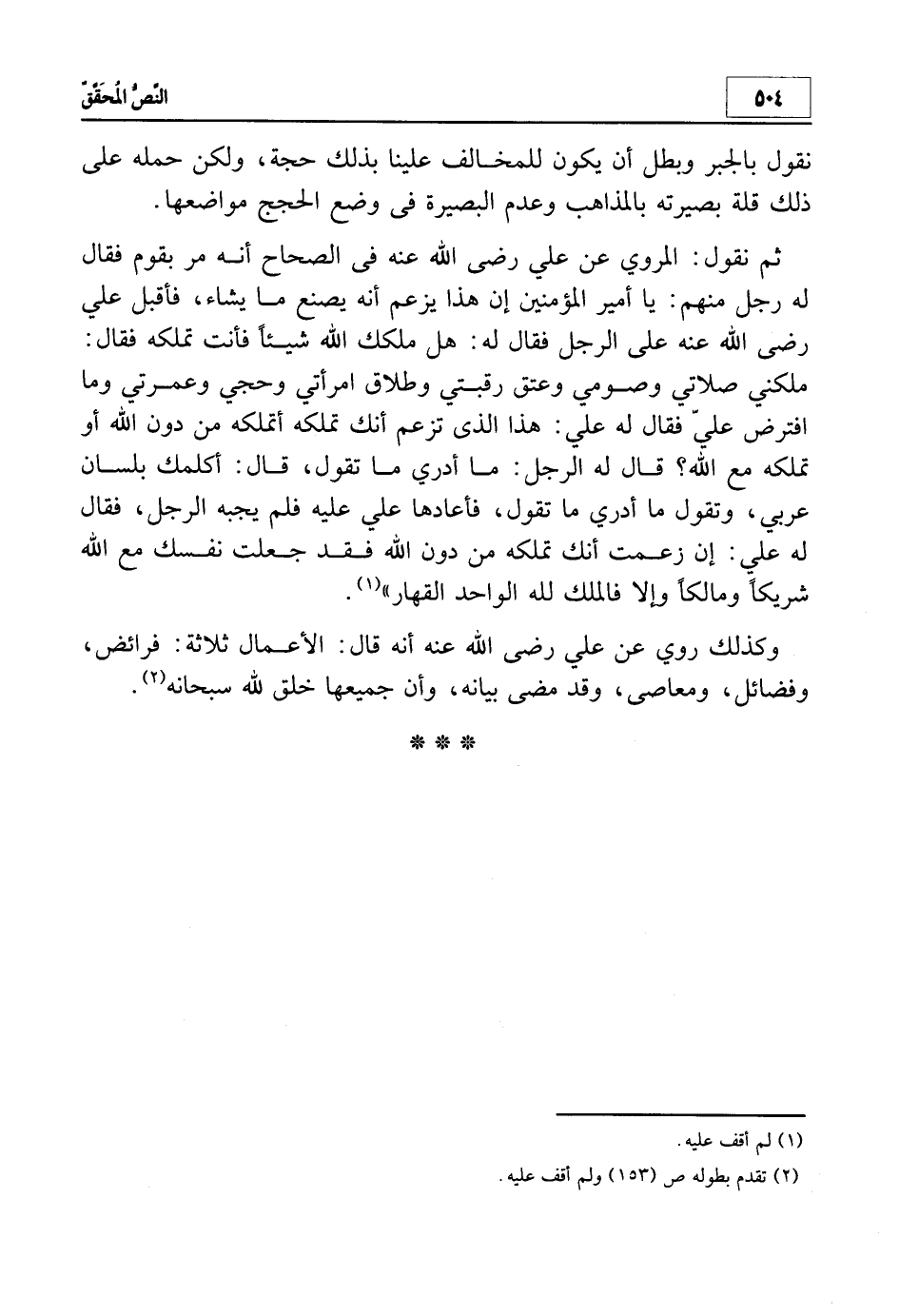 ثم نقول: المروي عن علي - رضي الله عنه - في الصحاح أنه مر بقوم فقال له رجل منهم: يا أمير المؤمنين إن هذا يزعم أنه يصنع ما يشاء، فأقبل علي - رضي الله عنه - على الرجل فقال له: هل ملكك الله شيئاً فأنت تملكه فقال: ملكني صلاتي وصومي وعتق رقبتي وطلاق امرأتي وحجي وعمرتي وما افترض علي فقال له علي: هذا الذي تزعم أنك تملكه أتملكه من دون الله أو تملكه مع الله؟ قال له الرجل: ما أدري ما تقول، قال: أكلمك بلسان عربي، وتقول ما أدري ما تقول، فأعادها علي عليه فلم يجبه الرجل، فقال له علي: إن زعمت أنك تملكه من دون الله فقد جعلت نفسك مع الله شريكاً ومالكاً وإلا فالملك لله الواحد القهار1.