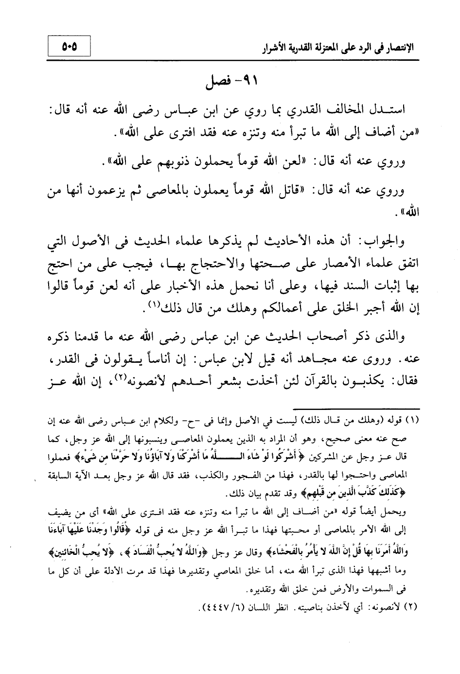 1 قوله (وهلك من قال ذلك) ليست في الأصل وإنما هي في - ح- ولكلام ابن عباس - رضي الله عنه - إن صح عنه معنى صحيح، وهو أن المراد به الذين يعملون المعاصي وينسبونها إلى الله عزوجل، كما قال عزوجل عن المشركين {سَيَقُولُ الَّذِينَ أَشْرَكُوا لَوْ شَاءَ اللَّهُ مَا أَشْرَكْنَا وَلا آبَاؤُنَا وَلا حَرَّمْنَا مِنْ شَيْء} فعملوا المعاصي واحتجوا لها بالقدر، فهذا من الفجور والكذب، فقد قال الله عزوجل بعد هذه الآية السابقة {كَذَلِكَ كَذَّبَ الَّذِينَ مِنْ قَبْلِهِمْ} وقد تقدم بيان ذلك.