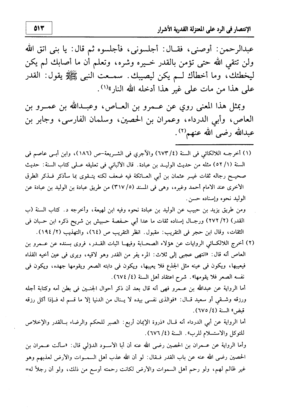 1 أخرجه اللالكائي في السنة 4/673، والآجري في الشريعة ص 186، وابن أبي عاصم في السنة 1/52 مثله من حديث الوليد بن عبادة. قال الألباني في تعليقه على كتاب السنة: "حديث صحيح ورجاله ثقات غير عثمان بن أبي العاتكة فيه ضعف لكنه يتقوى بما سأذكر فذكر الطرق الأخرى عند الإمام أحمد وغيره، وهي في المسند 5/317 من طريق عبادة بن الوليد بن عبادة عن الوليد نحوه وإسناده صحيح".