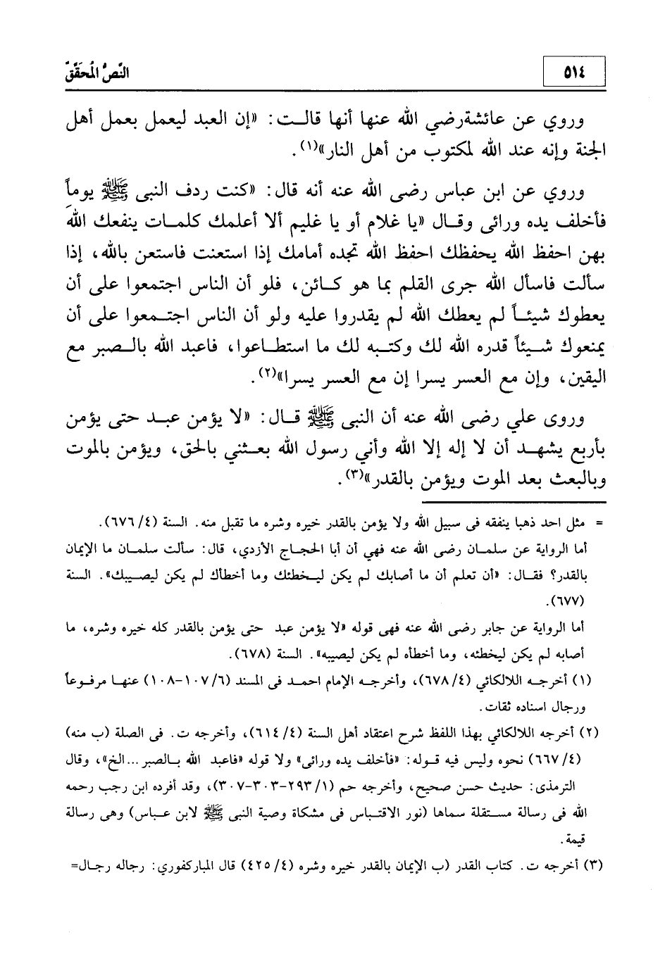 3 أخرجه ت. كتاب القدر (ب. الإيمان بالقدر خيره وشره 4/425 قال المباركفوري: رجاله رجال الصحيح. تحفة الأحوذي 6/358، جه. في المقدمة (ب. القدر) 1/32 نحوه، الحاكم في المستدرك 1/33، وقال: "حديث صحيح على شرط الشيخين" ووافقه الذهبي واللالكائي في السنة 4/620.