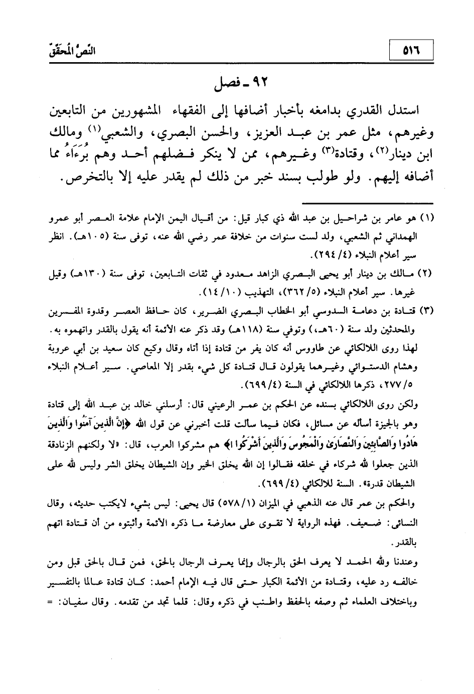 3 قتادة بن دعامة السدوسي أبو الخطاب البصري الضرير، كان حافظ العصر وقدوة المفسرين والمحدثين ولد سنة (60?) وتوفي سنة (118?) وقد ذكر عنه الأئمة أنه يقول بالقدر واتهموه به. لهذا روى اللالكائي عن طاووس أنه كان يفر من قتادة إذا أتاه وقال وكيع: كان سعيد بن أبي عروبة وهشام الدستوائي وغيرهما يقولون قال قتادة: "كل شيء بقدر إلا المعاصي". سير أعلام النبلاء 5/277، ذكرها اللالكائي في السنة 4/699.