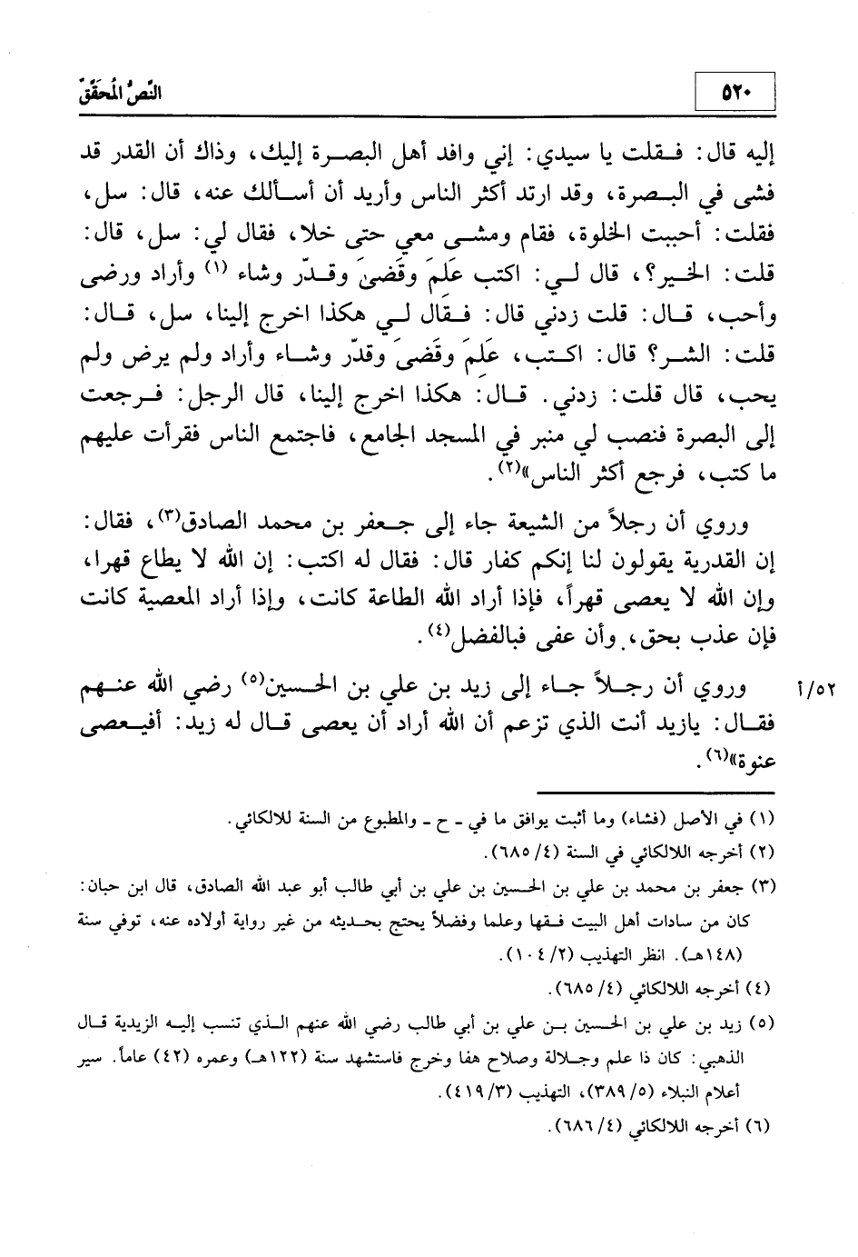 وروي أن رجلاً من الشيعة جاء إلى جعفر بن محمد الصادق 3،فقال: إن القدرية يقولون لنا إنكم كفار قال: فقال له: "اكتب عن الله لا يطاع قهراً، وإن الله لا يعصى قهراً، فإذا أراد الله الطاعة كانت، وإذا أراد المعصية كانت فإن عذب بحق، وإن عفا فبالفضل"4.
