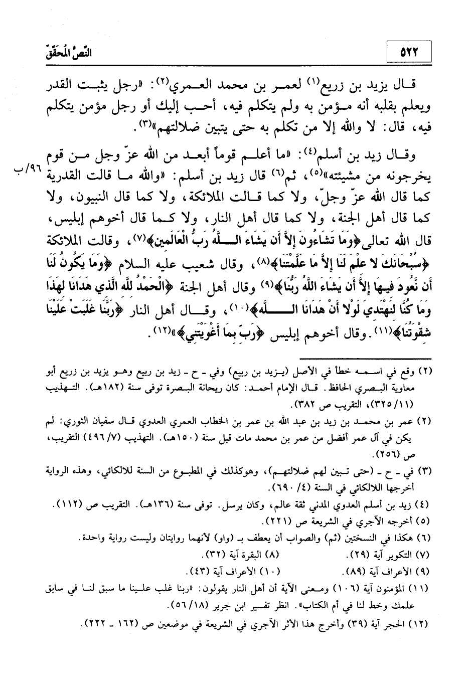 وقال زيد بن أسلم4: "ما أعلم قوماً أبعد من الله عزوجل من قوم يخرجونه من مشيئته"5، ثم6 قال زيد بن أسلم: "والله ما قالت القدرية كما قال الله عزوجل، ولا كما قالت الملائكة، ولا كما قال النبيون، ولا كما قال أهل الجنة، ولا كما قال أهل النار، ولا كما قال أخوهم إبليس، قال الله تعالى: {وَمَا تَشَاءُونَ إِلاّ أَنْ يَشَاءَ اللَّه رَبُّ الْعَالَمِينَ} 7، وقالت الملائكة: {سُبْحَانَكَ لا عِلْمَ لَنَا إِلاّ مَا عَلَّمْتَنَا} 8، وقال شعيب عليه السلام: {وَمَا يَكُونُ لَنَا أَنْ نَعُودَ فِيهَا إِلاّ أَنْ يَشَاءَ اللَّهُ رَبُّنَا} 9، وقال أهل الجنة: {الْحَمْدُ لِلَّهِ الَّذِي هَدَانَا لِهَذَا وَمَا كُنَّا لِنَهْتَدِيَ لَوْلا أَنْ هَدَانَا اللَّهُ} 10، وقال أهل النار: {رَبَّنَا غَلَبَتْ عَلَيْنَا شِقْوَتُنَا} 1 1. وقال أخوهم إبليس: {رَبِّ بِمَا أَغْوَيْتَنِي} 12".
