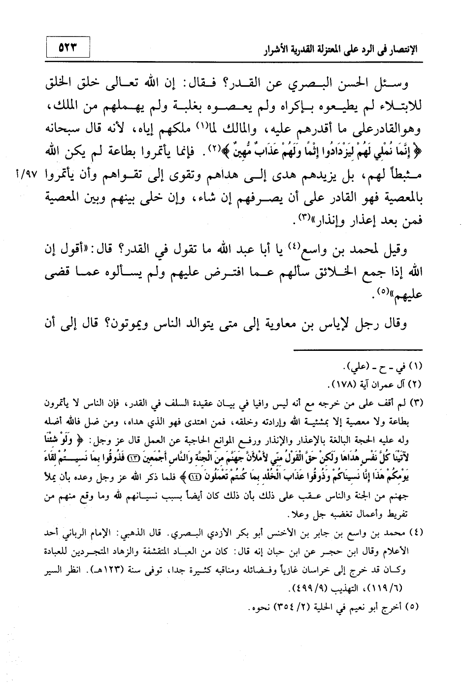 وسئل الحسن البصري عن القدر؟ فقال: "إن الله تعالى خلق الخلق للابتلاء لم يطيعوه بإكراه ولم يعصوه بغلبة ولم يهملهم من الملك، وهو القادر على ما أقدرهم عليه، والمالك لما1 ملكهم إياه، لأنه قال سبحانه: {إِنَّمَا نُمْلِي لَهُمْ لِيَزْدَادُوا إِثْماً وَلَهُمْ عَذَابٌ مُهِينٌ} 2. فإنما يأتمروا بطاعة لم يكن الله مثبطاً لهم، بل يزيدهم هدى إلى هداهم وتقوى إلى تقواهم وأن يأتمروا بالمعصية فهو القادر على أن يصرفهم إن شاء، وإن خلى بينهم وبين المعصية فمن بعد إعذار وإنذار"3.