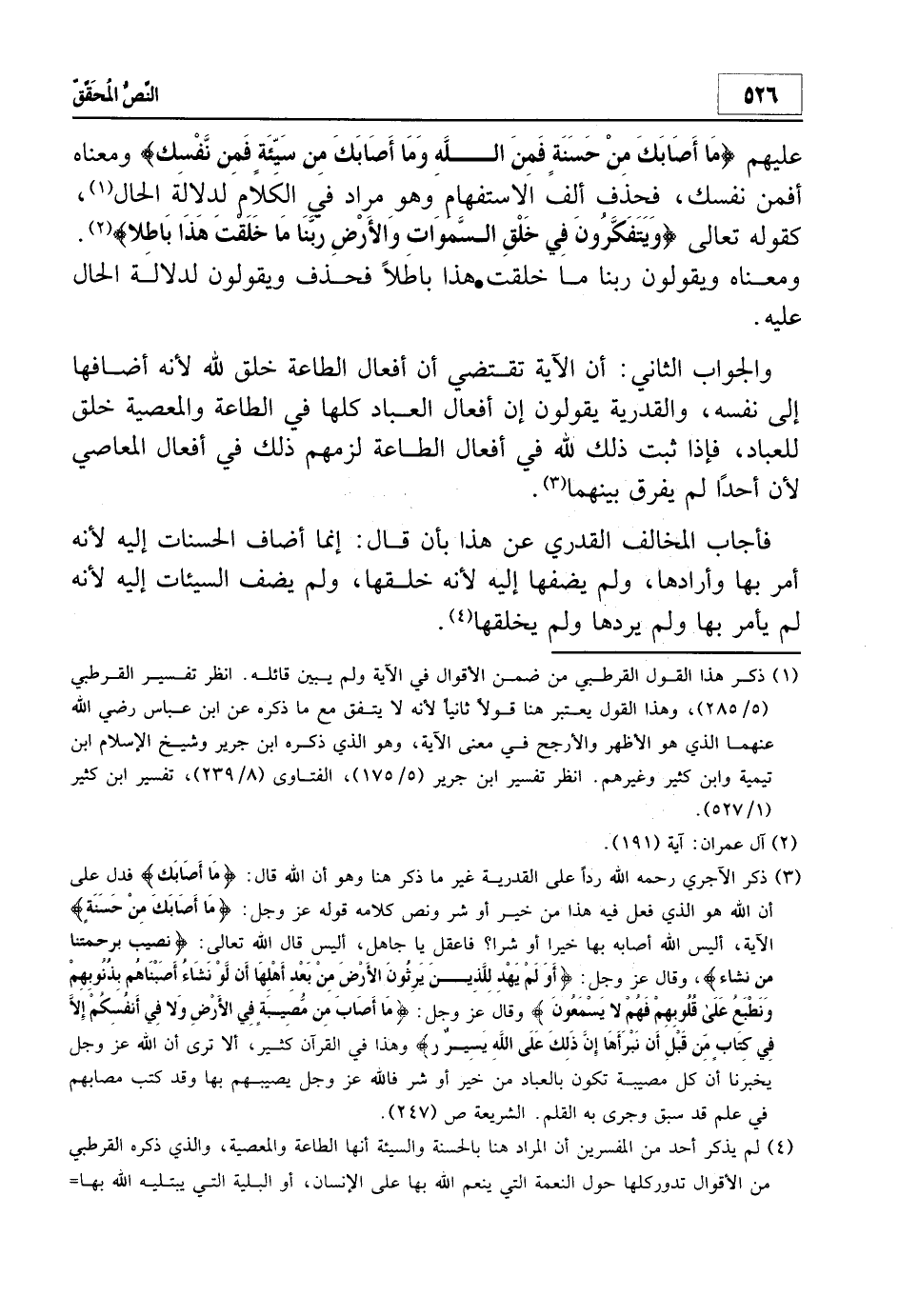 3 ذكر الآجري - رحمه الله - رداً على القدرية غير ما ذكر هنا وهو أن الله قال: {مَا أَصَابَكَ} فدل على أن الله هو الذي فعل فيه هذا من خير أو شر ونص كلامه عزوجل: {مَا أَصَابَكَ مِنْ حَسَنَةٍ} الآية، أليس الله أصابه بها خيراً أو شراً؟ فاعقل يا جاهل، أليس قال الله تعالى: {نُصِيبُ بِرَحْمَتِنَا مَنْ نَشَاءُ} ، وقال عزوجل: {أَوَلَمْ يَهْدِ لِلَّذِينَ يَرِثُونَ الأرْضَ مِنْ بَعْدِ أَهْلِهَا أَنْ لَوْ نَشَاءُ أَصَبْنَاهُمْ بِذُنُوبِهِمْ وَنَطْبَعُ عَلَى قُلُوبِهِمْ فَهُمْ لا يَسْمَعُونَ} وقال عزوجل: {مَا أَصَابَ مِنْ مُصِيبَةٍ فِي الأرْضِ وَلا فِي أَنْفُسِكُمْ إِلاّ فِي كِتَابٍ مِنْ قَبْلِ أَنْ نَبْرَأَهَا إِنَّ ذَلِكَ عَلَى اللَّهِ يَسِيرٌ} وهذا في القرآن كثير، ألا ترى أن الله عزوجل يخبرنا أن كل مصيبة تكون بالعباد من خير أو شر فالله عز وجل يصيبهم بها وقد كتب مصابهم في علم قد سبق وجرى به القلم. الشريعة ص 247.