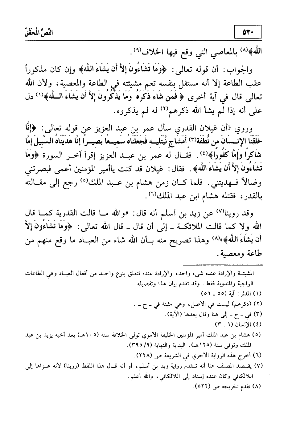 وروي أن غيلان القدري سأل عمر بن عبد العزيز عن قوله تعالى: {إِنَّا خَلَقْنَا الإنْسَانَ مِنْ نُطْفَةٍ أَمْشَاجٍ نَبْتَلِيهِ فَجَعَلْنَاهُ سَمِيعاً بَصِيراً إِنَّا هَدَيْنَاهُ السَّبِيلَ إِمَّا شَاكِراً وَإِمَّا كَفُوراً} 5. فقال له عمر بن عبد العزيز: إقرأ آخر السورة {وَمَا تَشَاءُونَ إِلاّ أَنْ يَشَاءَ اللَّهُ} . فقال غيلان: "قد كنت يا أمير المؤمنين أعمى فبصرتني وضالاً فهديتني"، فلما كان زمن هشام بن عبد الملك6 رجع إلى مقالته بالقدر، فقتله هشام ابن عبد الملك7.