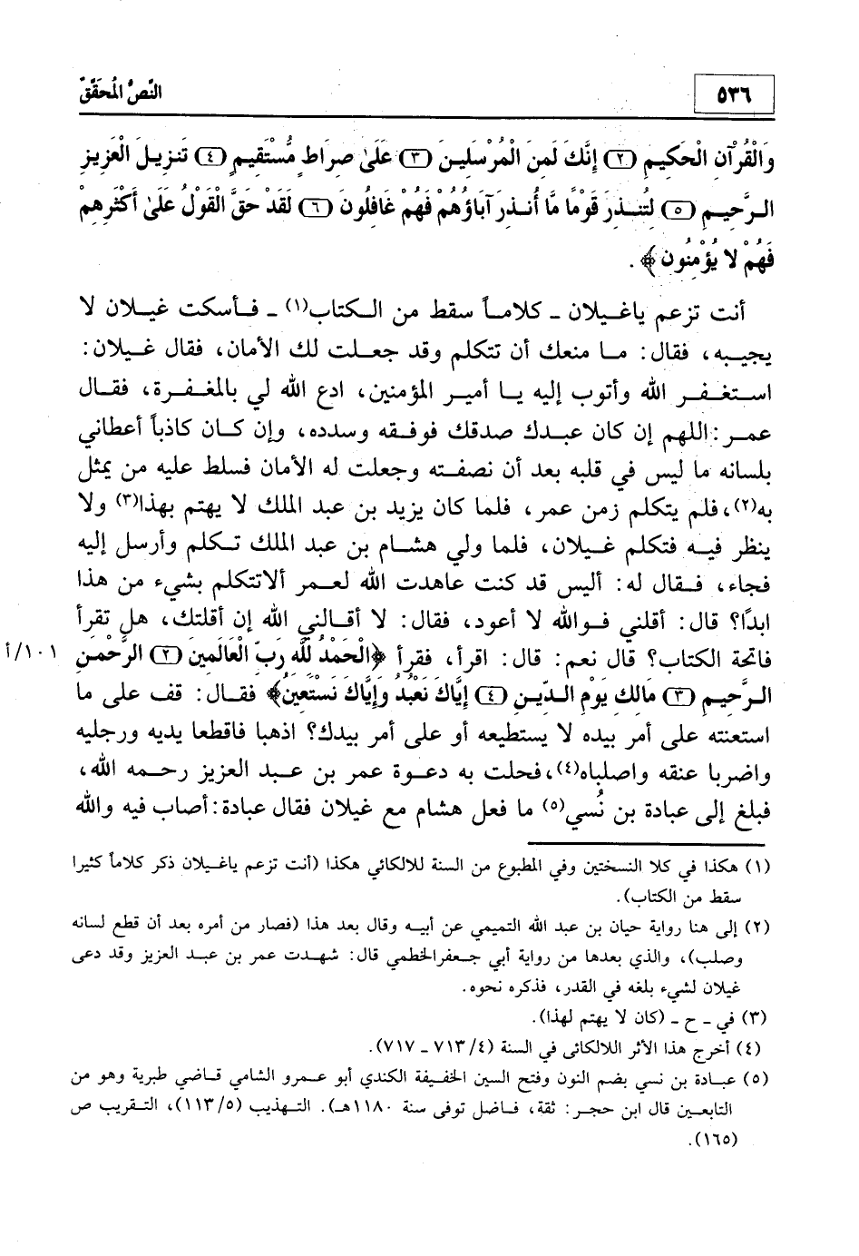 1 هكذا في كلا النسختين وفي المطبوع من السنة للالكائي هكذا (أنت تزعم يا غيلان ذكر كلاماً كثيراً سقط من الكتاب) .
