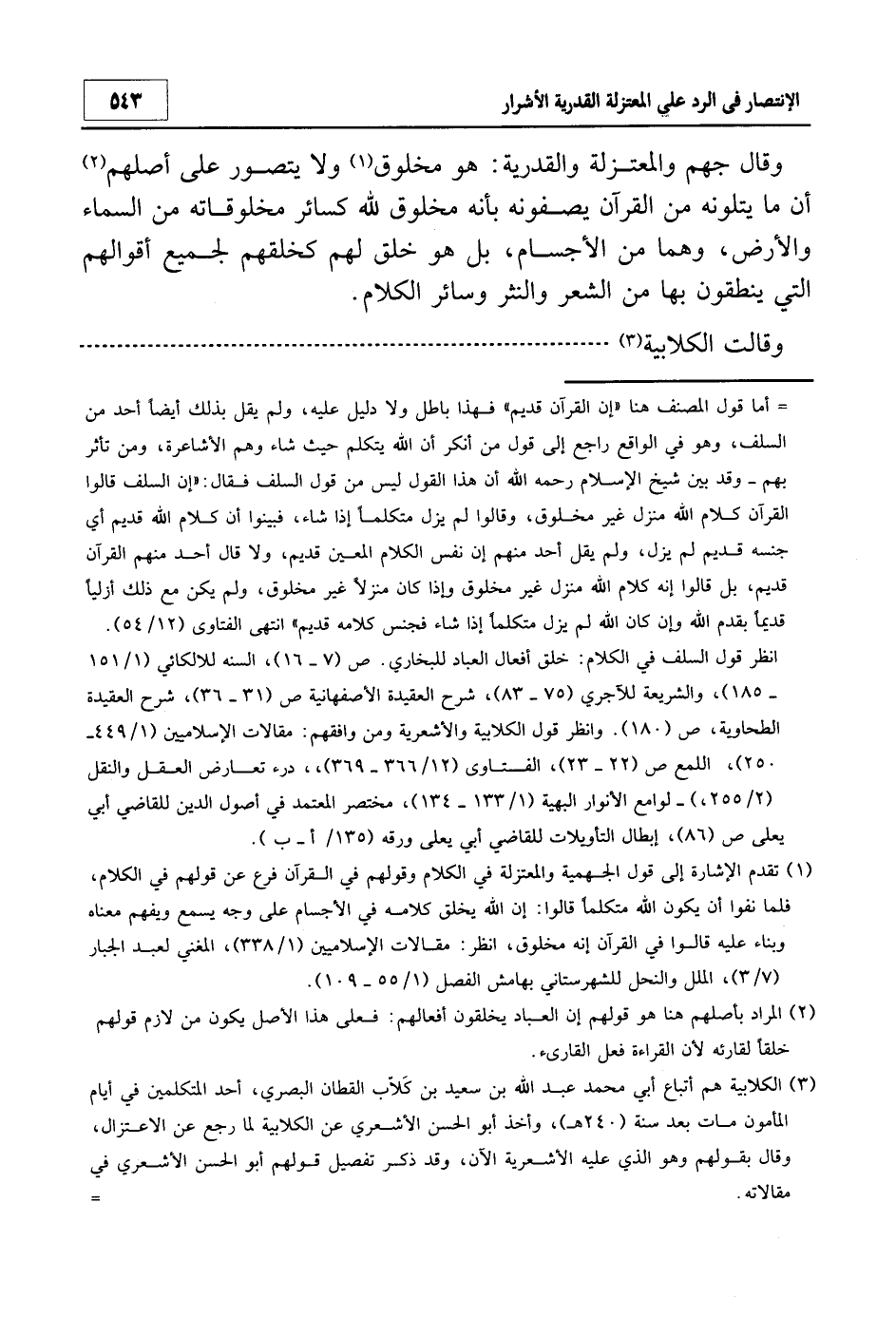 2 المراد بأصلهم هنا هو قولهم إن العباد يخلقون أفعالهم، فعلى هذا لأصل يكون من لازم قولهم خلقاً لقارئه لأن القراءة فعل القارئ.