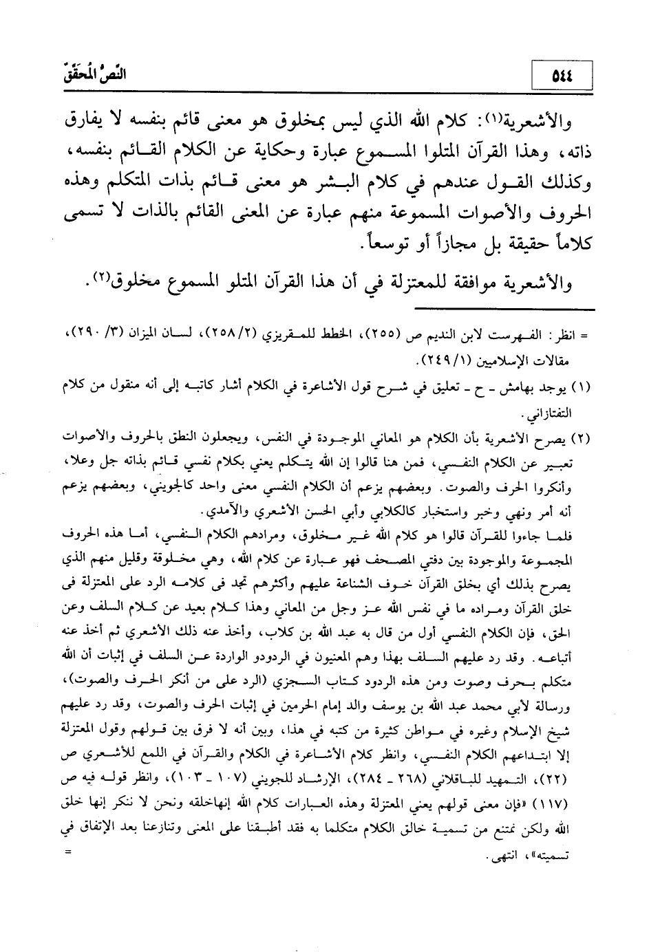 وانظر: شرح جوهرة التوحيد ص 94 حيث صرح شارحها أن القرى، المقروء مخلوق، وقد صرح بخلق القرآن الموجود بين أيدي الناس من المتأخرين محمد أبو زهرة في كتابه تاريخ المذاهب الإسلامية ص 504 بعد أن نسب إلى الإمام أحمد أنه كان أول الأمر متوقفاً في القرآن، وهذا كلام باطل لا يقوله أحد اطلع على أقوال الإمام أحمد والأئمة قبله في كلام الله والقرآن الكريم، وقد كان الإمام أحمد يعتبر المتوقف في القرآن جهمياً شاكاً وسيفرد المصنف للواقفة في القرآن فصلاً.