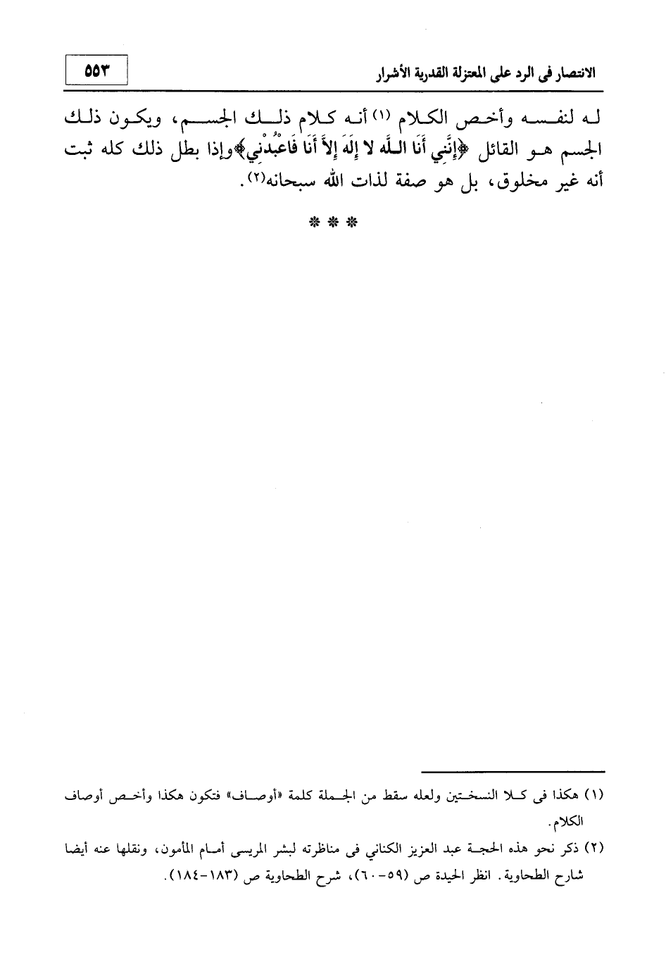 2 ذكر نحو هذه الحجة عبد العزيز الكناني في مناظرته لبشر المريسي أمام المأمون، ونقلها عنه أيضاً شارح الطحاوية.