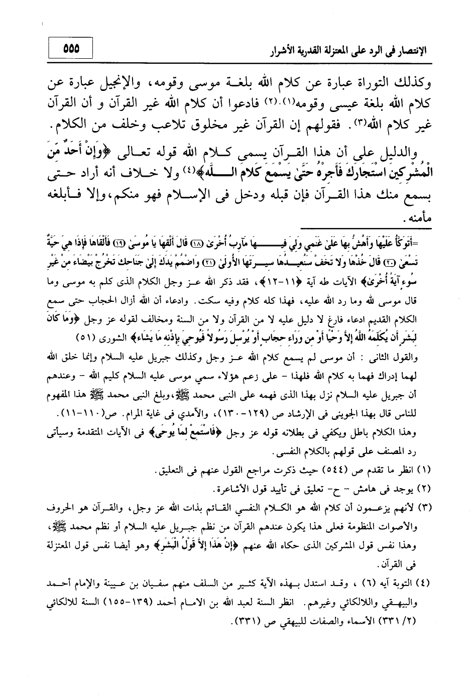 وكذلك التوراة عبارة عن كلام الله بلغه موسى وقومه، والإنجيل عبارة عن كلام الله بلغه عيسى قومه12 فادعوا أن كلام الله غير القرآن وأن القرآن غير كلام الله3. فقولهم إن القرآن غير مخلوق تلاعب وخلف من الكلام.